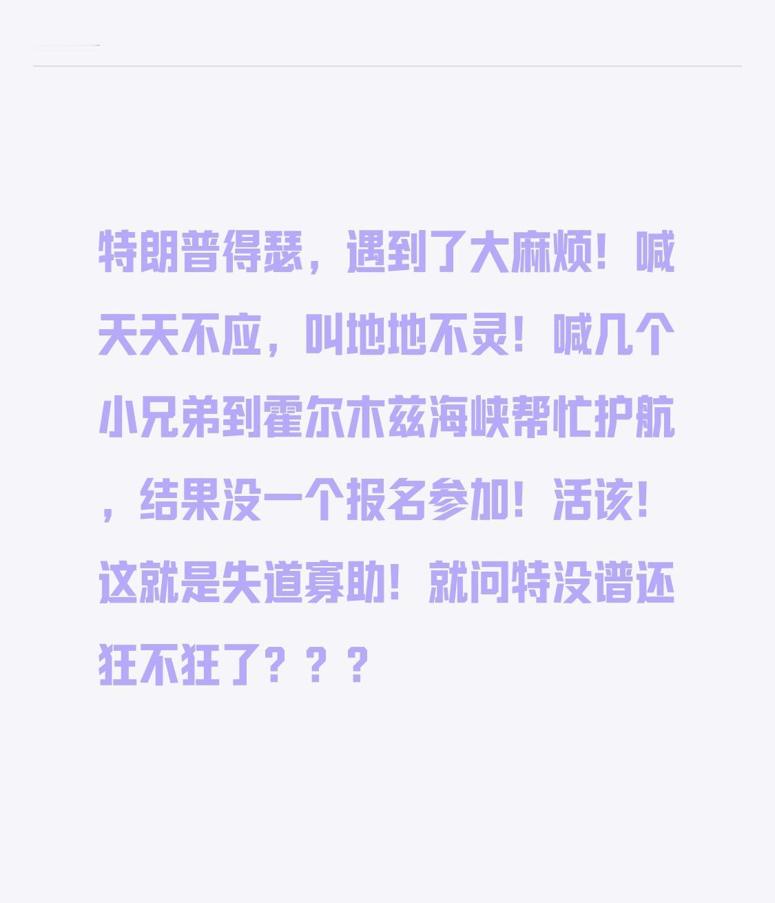 特朗普得瑟,遇到了大麻烦!喊天天不应,叫地地不灵! 喊几个小兄弟到霍尔木兹海峡帮
