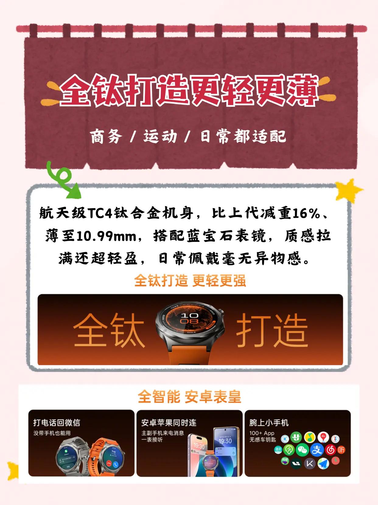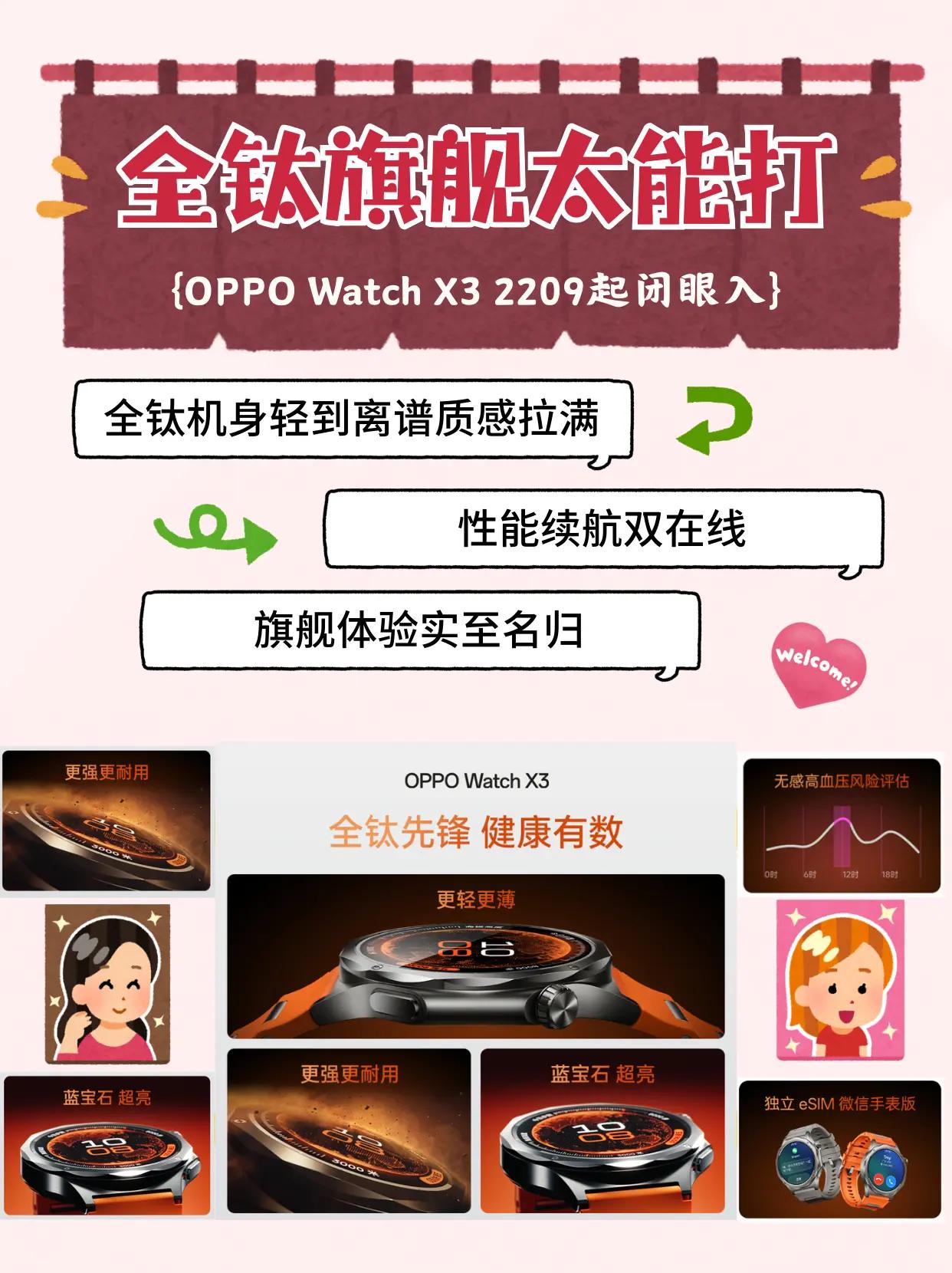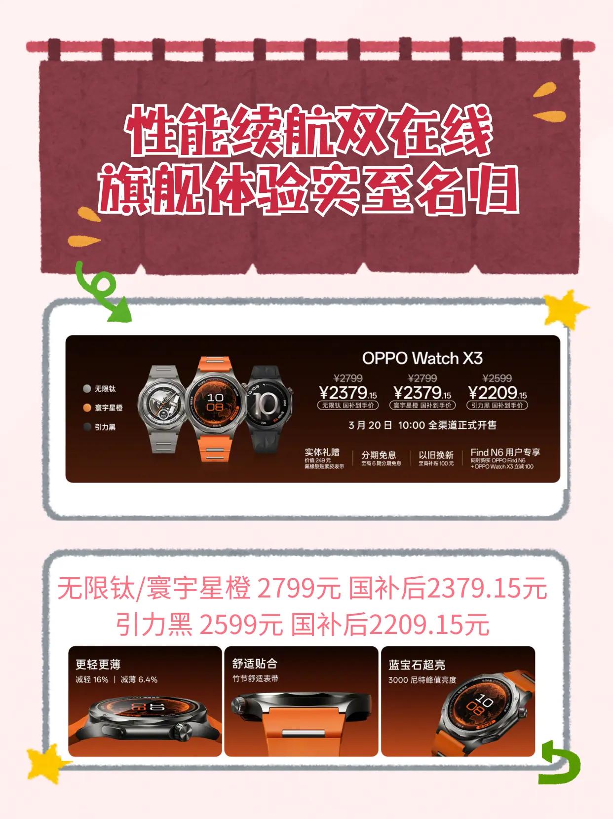 全钛旗舰太能打!2209元拿下OPPO Watch X3 OPPO Watch X3售价正式公布!同价位唯一全钛健康旗舰,2209元起真的太香了航天级TC4钛合金机身,比上代减重16%、薄至10.99mm,搭配蓝宝石表镜,质感拉满还超轻盈,终于摆脱智能手表厚重硌手的噩梦! 最戳我的就是这个无感高血压风险评估(非医疗诊断,仅供健康参考),无需绑袖带就能日常监测,搭配60秒体检、血氧、心率等全维度健康监测,打工人健康管理超省心。骁龙W5+双芯流畅度拉满,eSIM、微信手表版功能齐全,632mAh冰川电池,全智能模式续航5天,长续航模式达16天,充电10分钟就能畅用一整天,再也不用天天找充电器。。 无限钛/寰宇星橙 2799元 国补后2379.15元引力黑 2599元 国补后2209.15元现已全渠道开启预订,3月20日10:00正式开售!同价位找不到第二块全钛+无感高血压风险评估的智能手表,颜值、健康、性能全拉满,颜值、健康、性能全拉满,安卓党直接冲就对了!oppowatchx3 OPPO手表安卓表皇 oppo手表 这个东西不白买