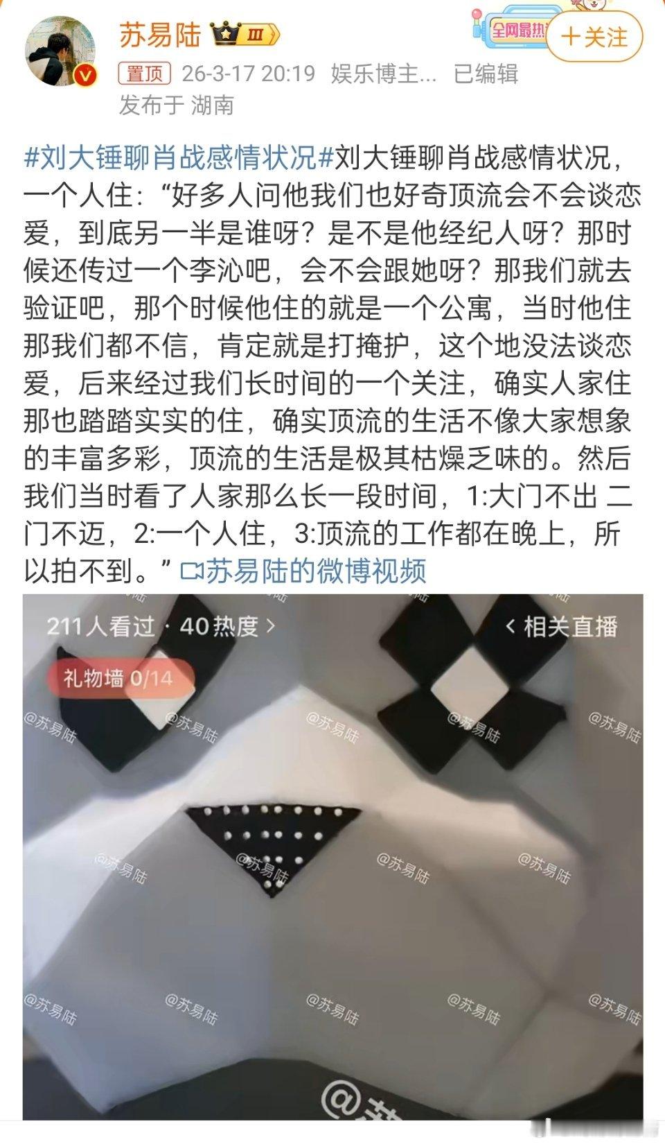 刘大锤聊肖战感情状况狗仔说以前传过李沁,是假的。顶流的生活极其枯燥,大门不出二门不迈,一个人住,什么都拍不到刘大锤说肖战大门不出二门不迈