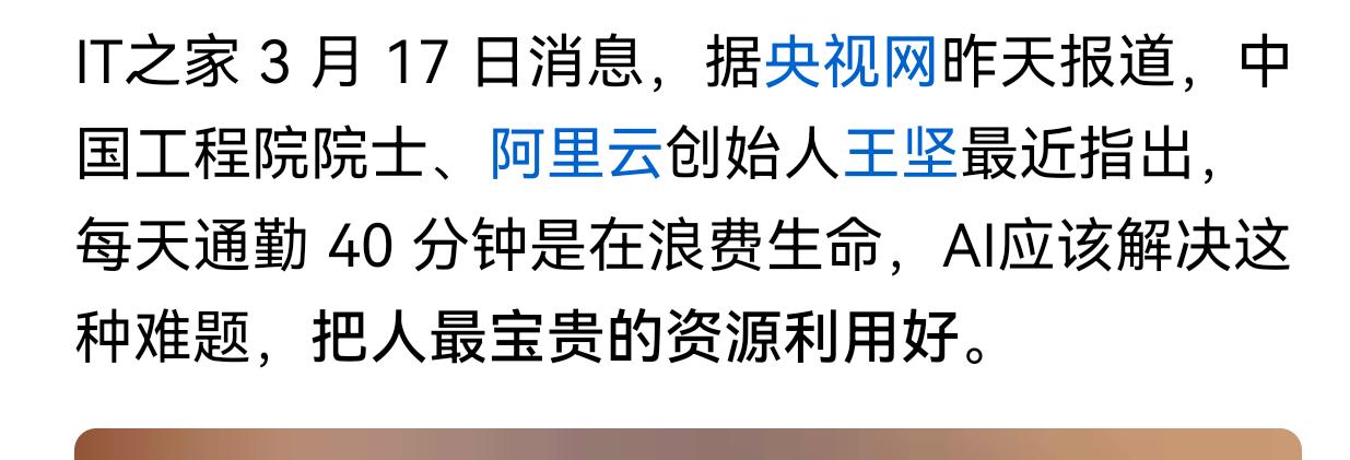 阿里云说通勤40分钟每天是浪费生命。可叹,在杭州每天浪费4倍生命,往返达2小时。近年来,期待过城市大脑和数智治理,没有任何通勤改善,除非允许迟到错开高峰期。 AI技术到底有多高不理解,就效果来看体验一般。