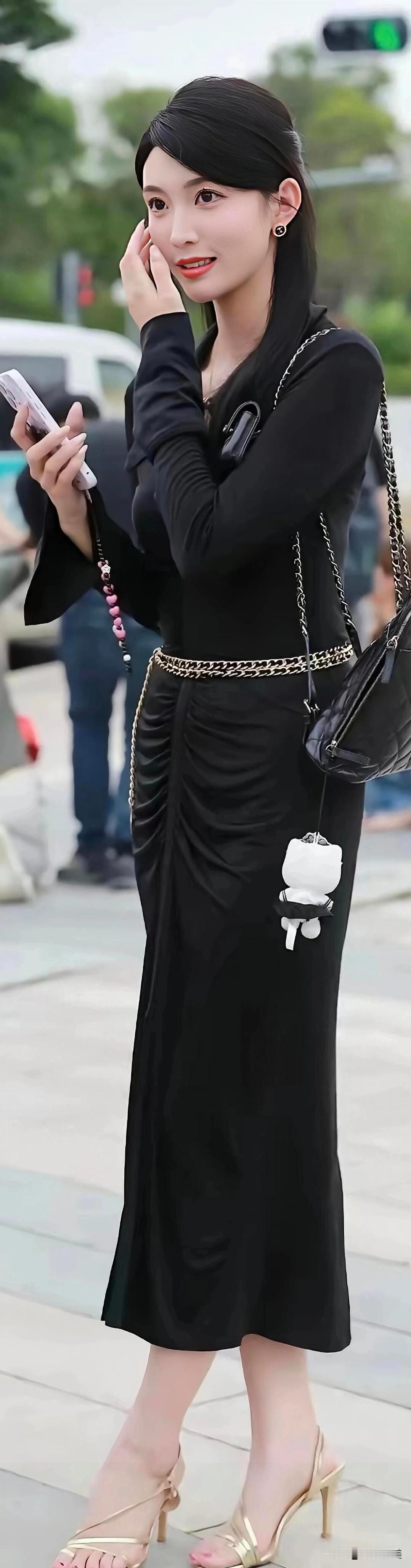 黑色修身长裙配金色细带高跟,简约又显气质,链条腰带和小包包点缀得恰到好处,日常出