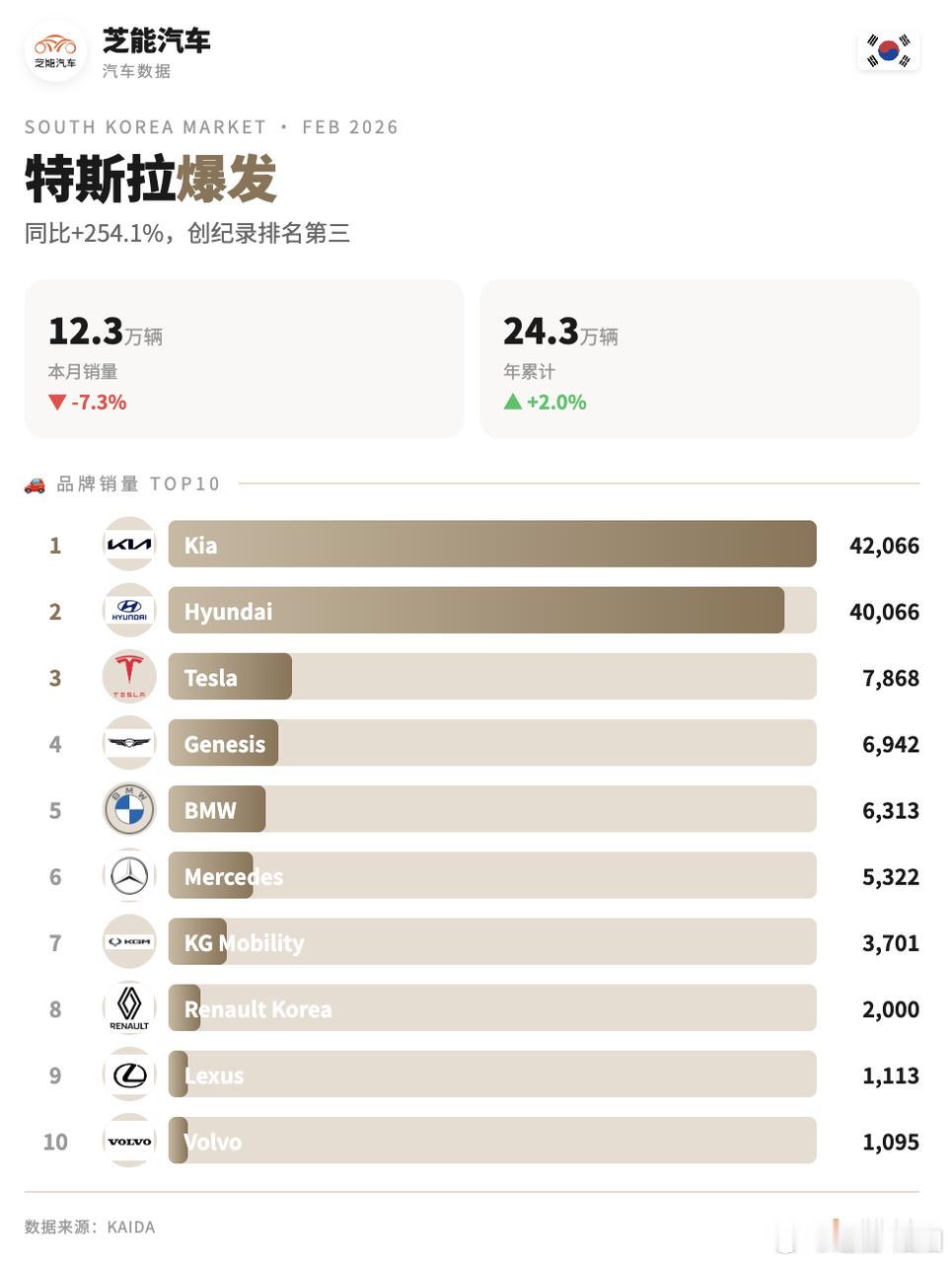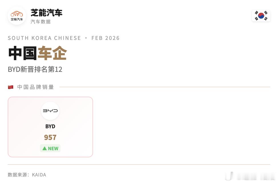 2026 年 2 月韩国车市整体偏弱,本土品牌销量下滑明显,进口品牌反而逆势走强,份额明显提升。
