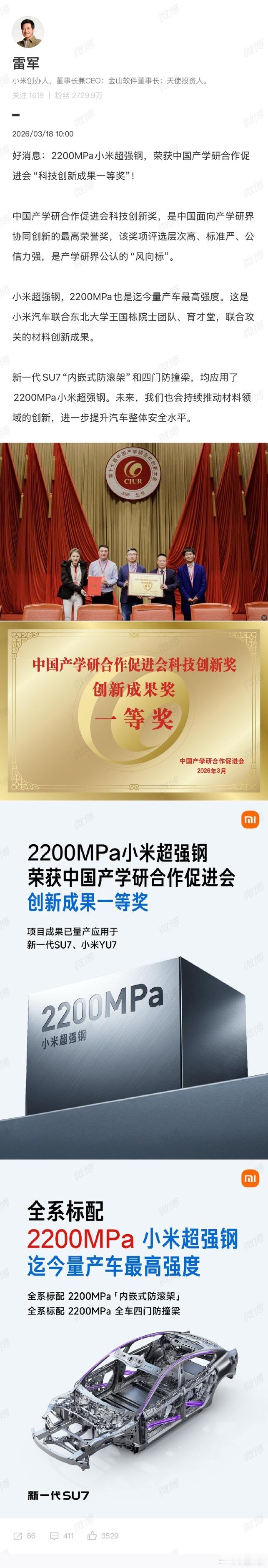大家有没有发现,现在不管是车企也好其它各行各业也好,大家都非常注重技术创新,都想在各自领域将领先技术握在手上。小米超强钢获得国家级科技一等奖,就显示出它的创新实力了。能拿奖已经很不容易,更何况还是一等奖。网上那些唱衰的朋友们,可以歇歇了。小米成长起来了,这是不容争辩的事实。2200MPa小米超强钢这次获得“产学研合作科技创新成果一等奖”,不仅是一份荣誉,也是行业对其技术的认可和肯定。新一代SU7“内嵌式防滚架”和四门防撞梁,都采用了2200MPa小米超强钢。这就意味着,车辆在突发或极限状况下有更好的安全性,能更好的守护用户的生命安全。安全才是最大的豪华,技术创新最终会落地到用户身上。根据目前曝光的消息来看,新SU7各方面较老款都有提升,看得出来,小米是真的用心在做产品的。
