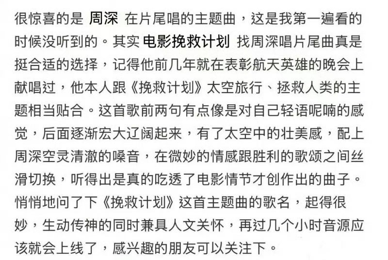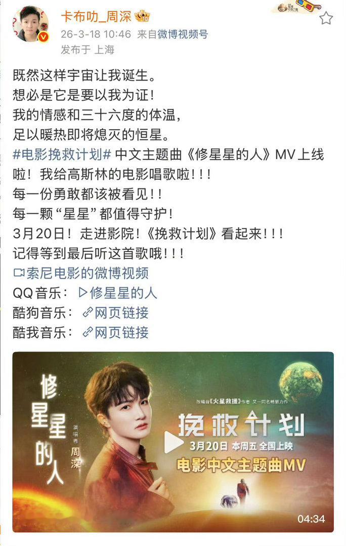 周深说给高斯林的电影唱歌啦 被周深这首主题曲狠狠击中!为高斯林新片《挽救计划》献声,宏大浪漫,合作意义满分✨