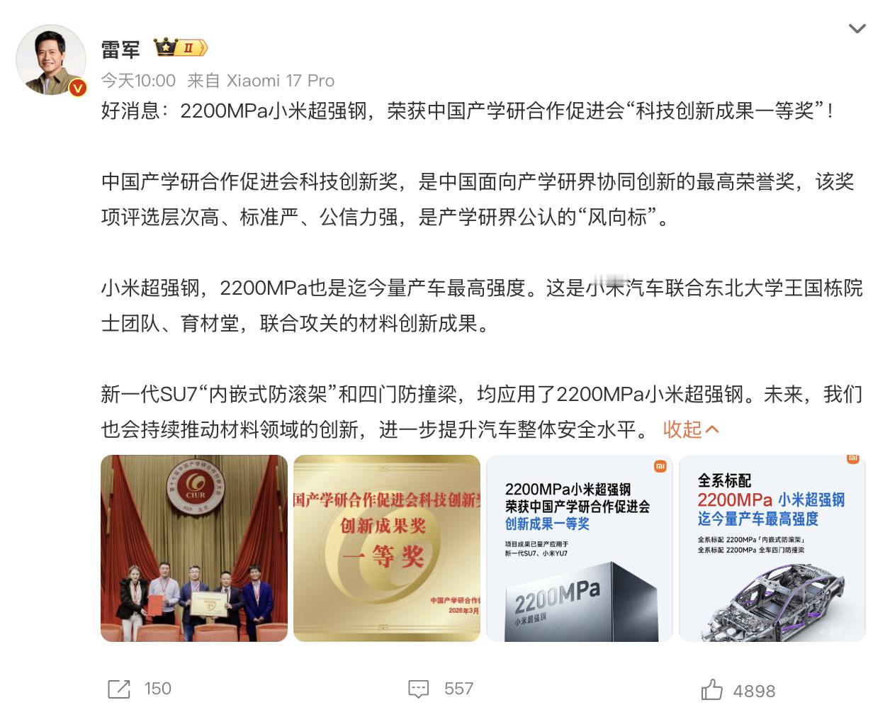小米超强钢获得国家级科技一等奖 原来小米汽车早就悄悄搞硬科技了说实话,现在车企卷