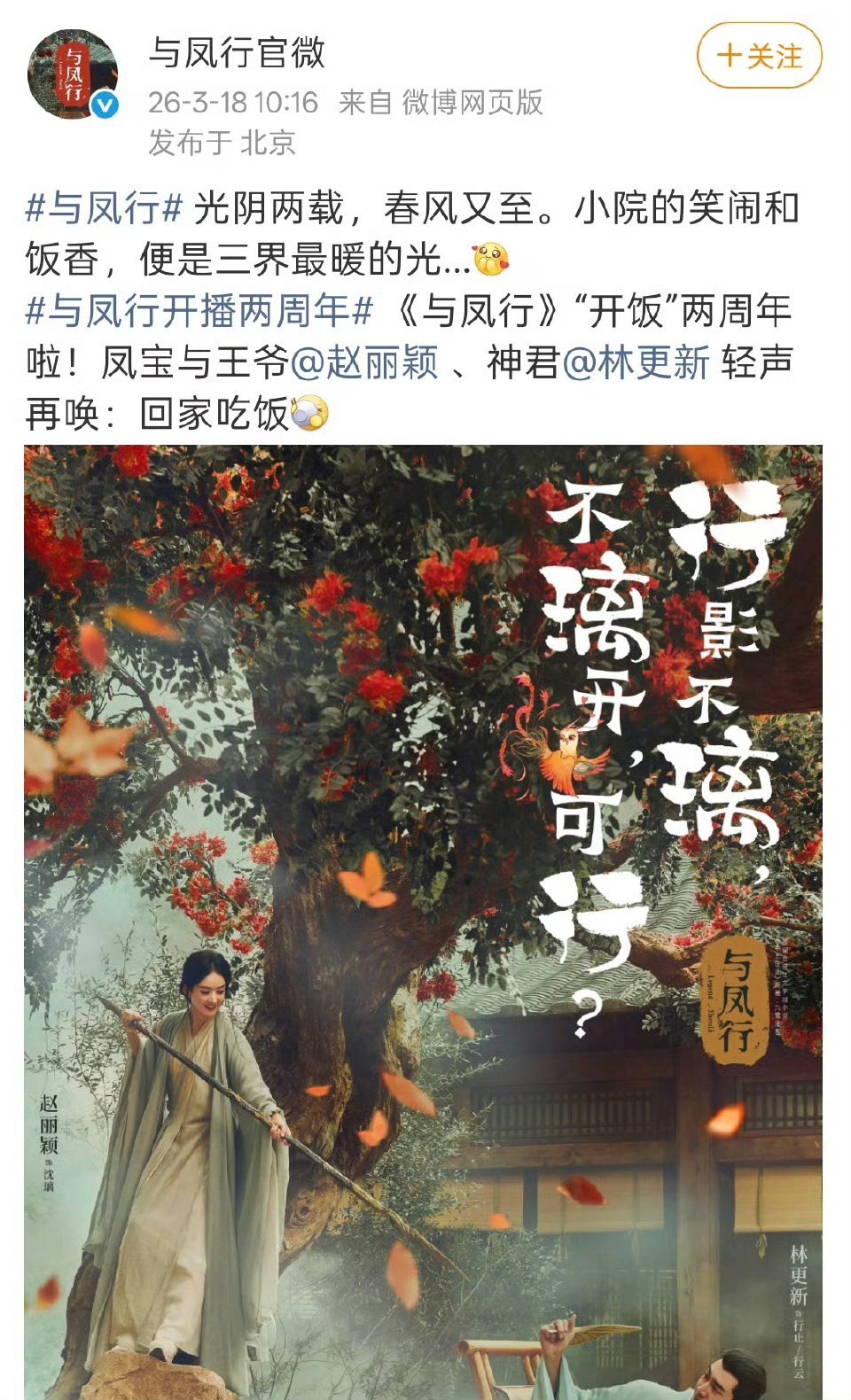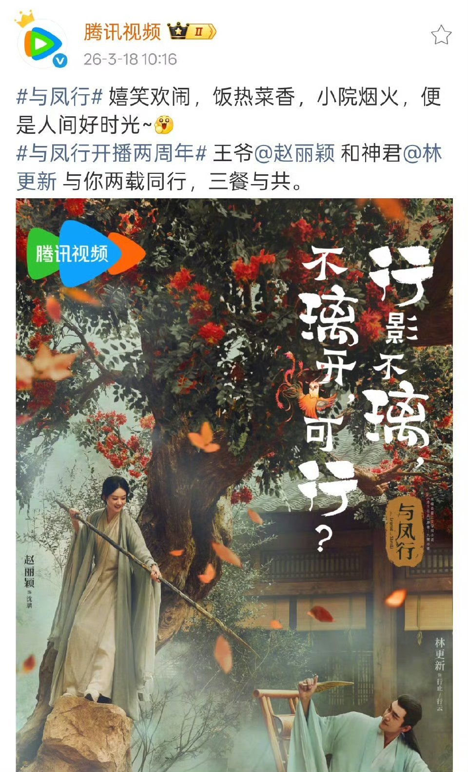 赵丽颖与凤行开播两周年《与凤行》官博、腾讯视频、芒果TV全部卡点赵丽颖生日10: