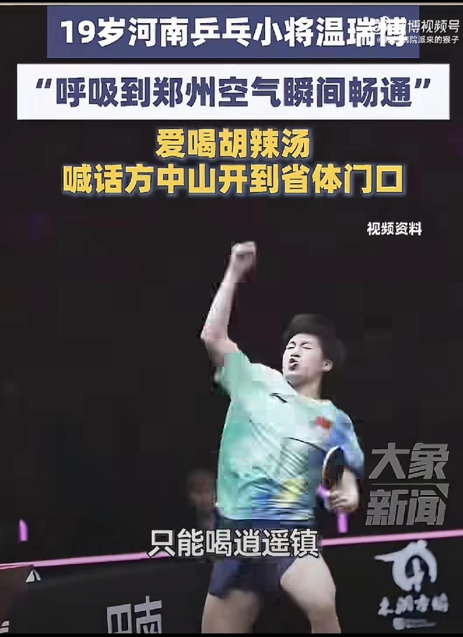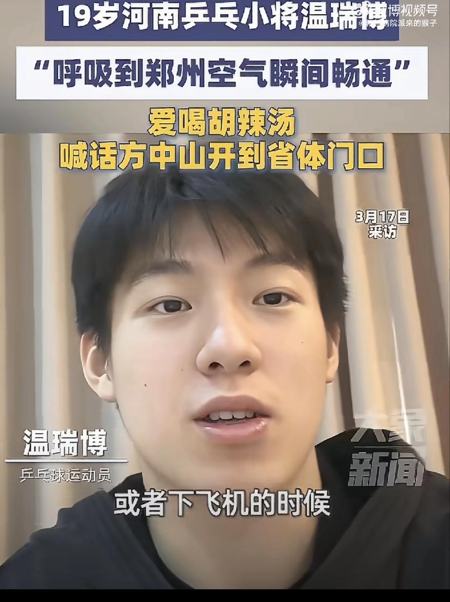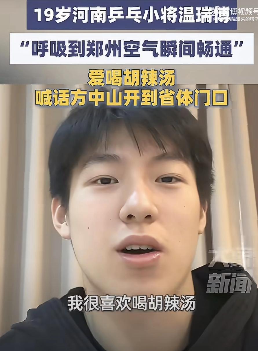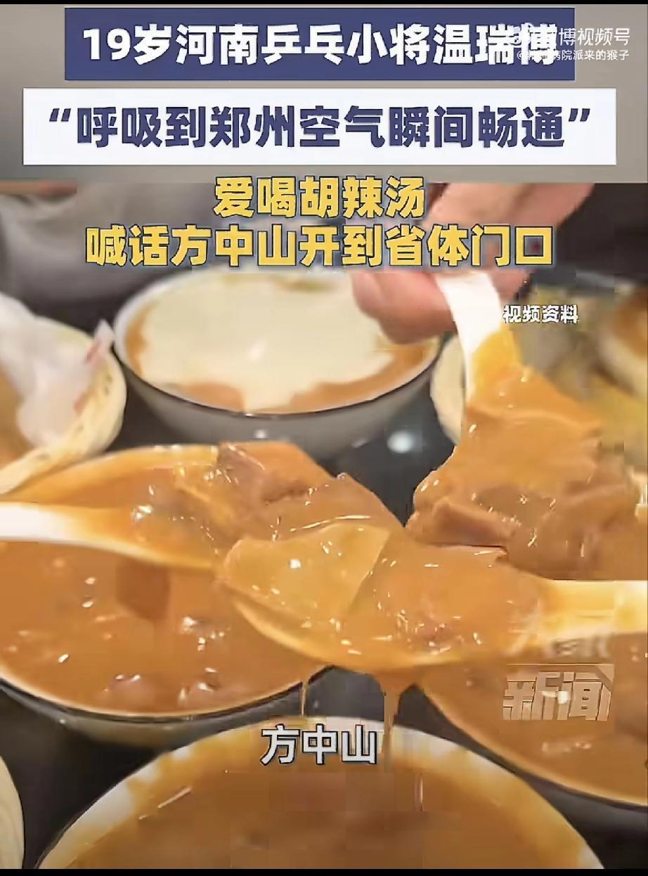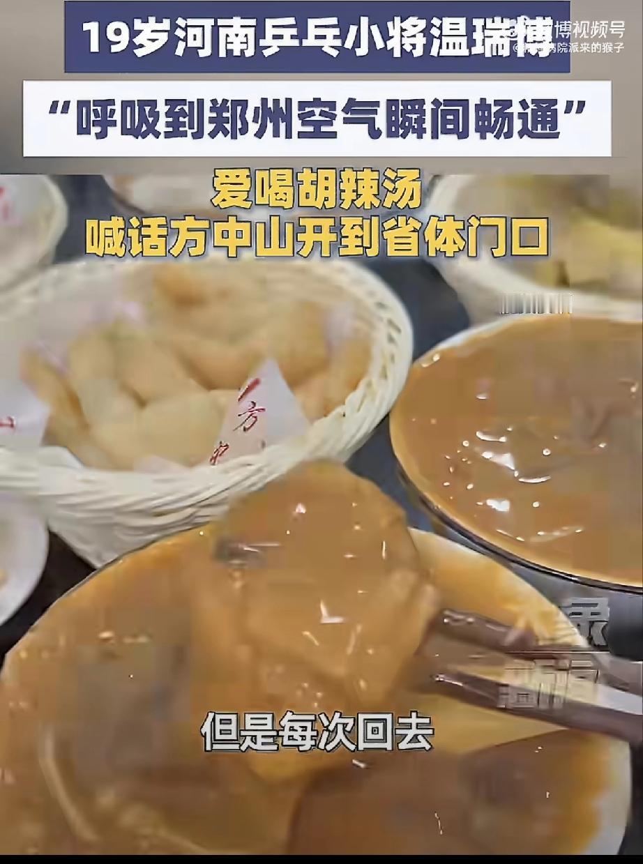 原来温瑞博爱喝胡辣汤[赞][捂脸], 温瑞博是河南郑州的小伙子,那肯定是从小喝胡辣汤长大的孩子,他在第十五届全运会乒乓球男子U18单打决赛中夺冠,为河南队赢得了该项目历史上的首枚金牌[赞]。 这几天网上流传着几段温瑞博的视频,有一段视频中他说呼吸到郑州的空气,就感觉一下就通畅了。他很喜欢喝胡辣汤,尤其是方中山胡辣汤,他也很喜欢吃烩面[笑哭]。 这是标准的河南郑州人啊,郑州人基本上都是这样的。