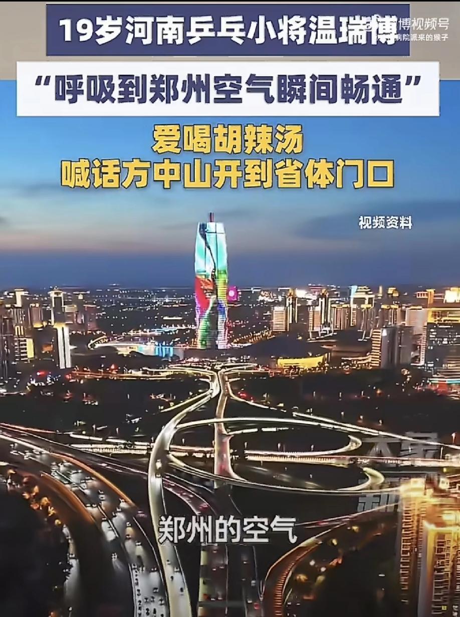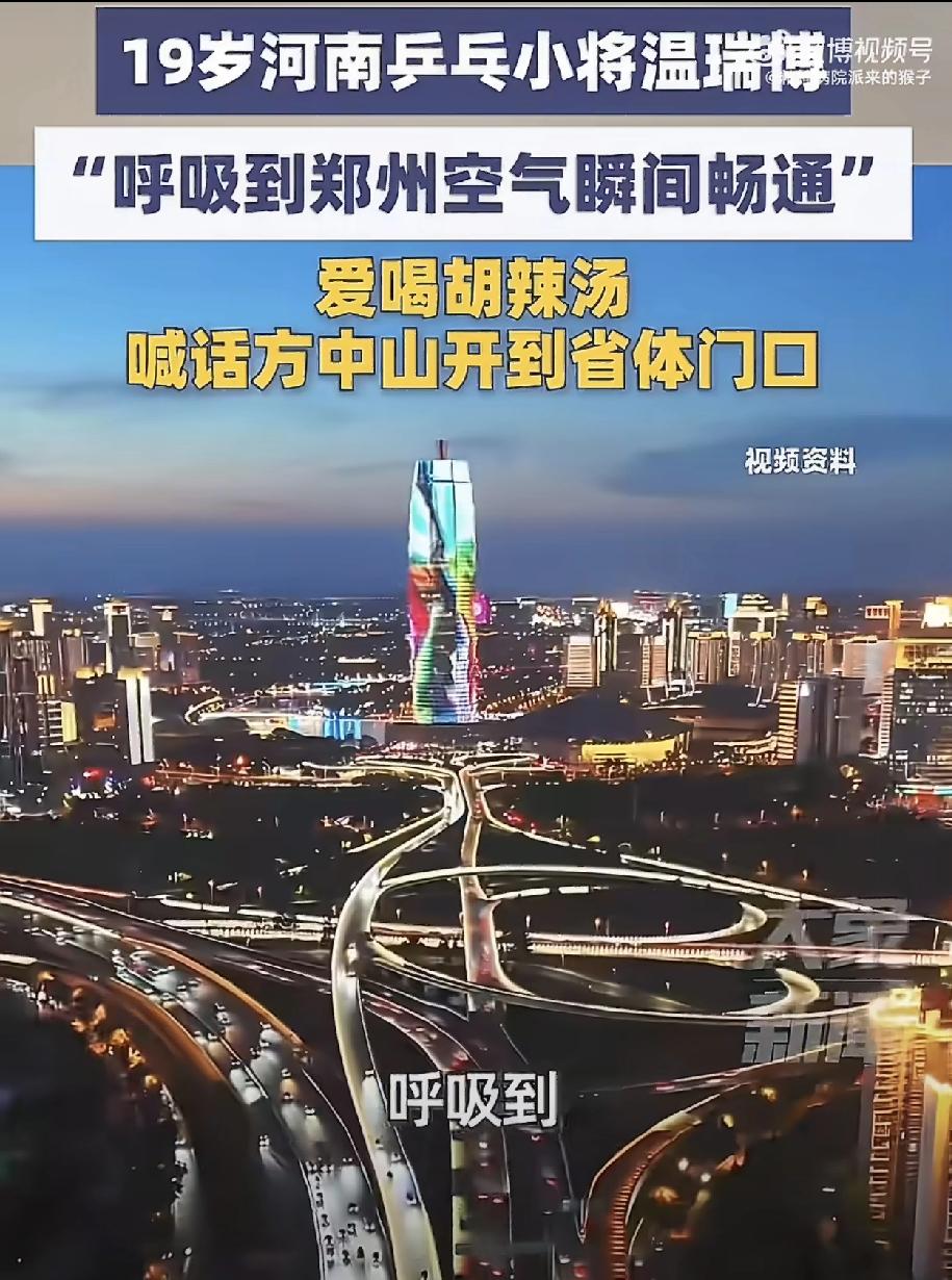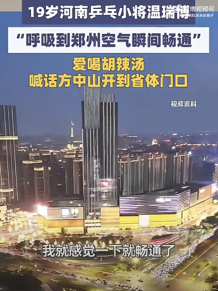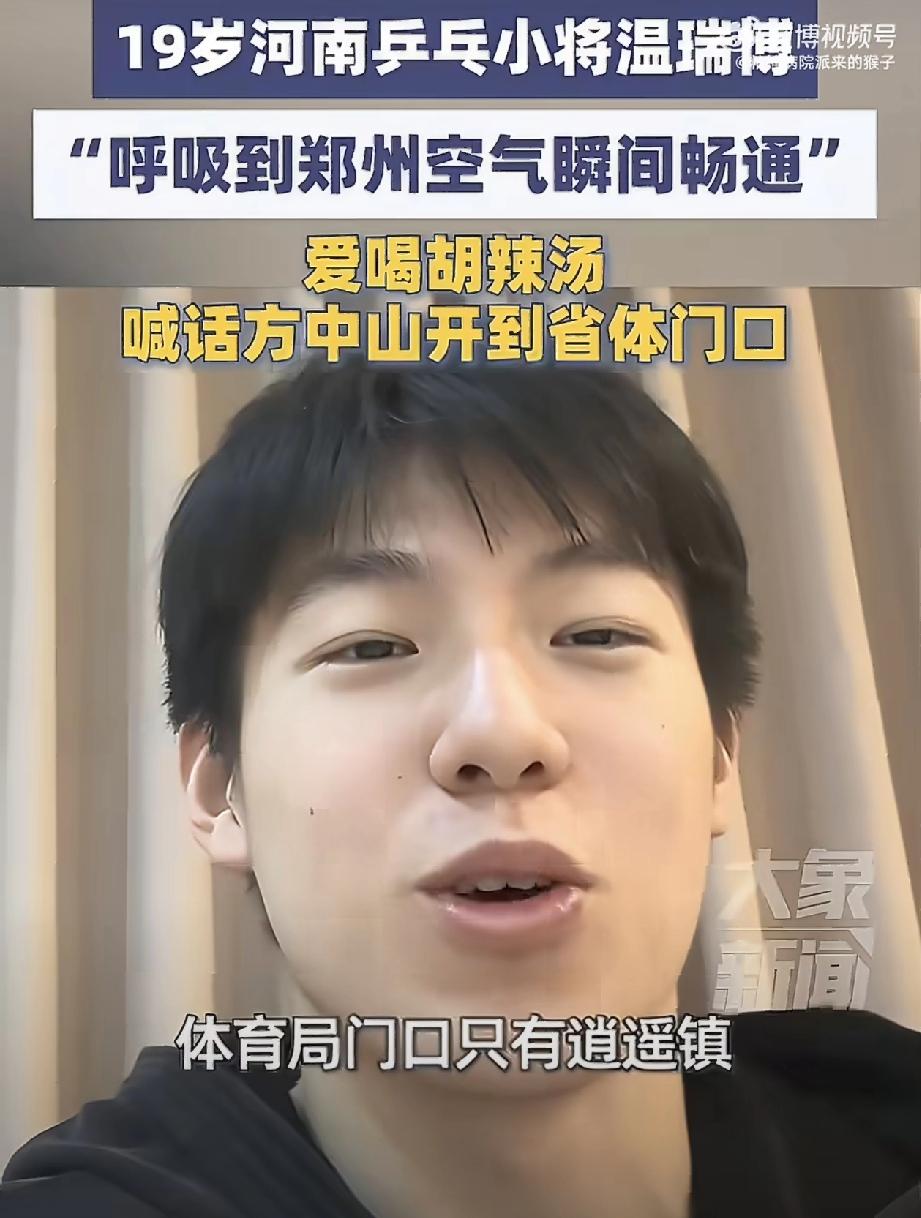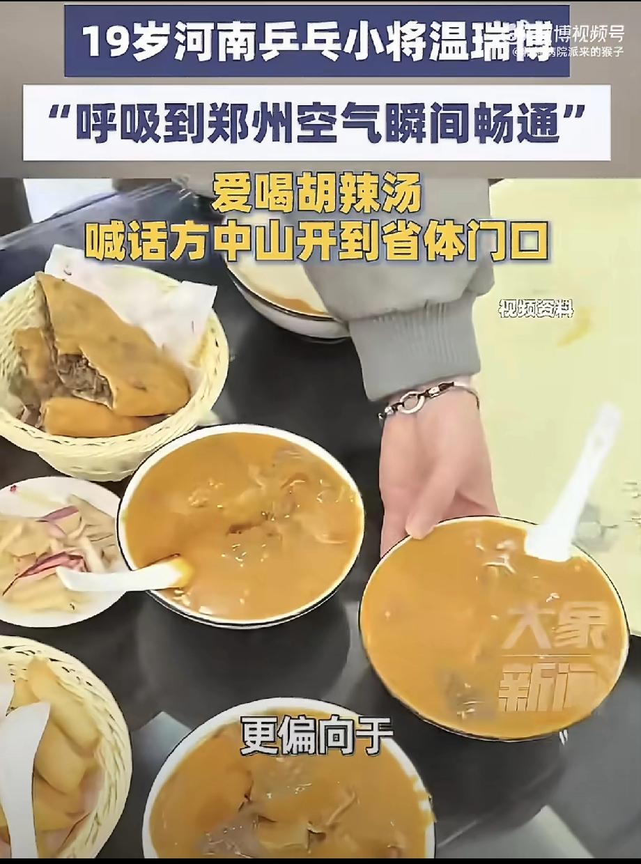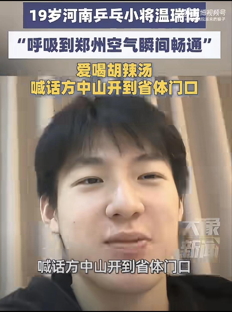 原来温瑞博爱喝胡辣汤[赞][捂脸], 温瑞博是河南郑州的小伙子,那肯定是从小喝胡辣汤长大的孩子,他在第十五届全运会乒乓球男子U18单打决赛中夺冠,为河南队赢得了该项目历史上的首枚金牌[赞]。 这几天网上流传着几段温瑞博的视频,有一段视频中他说呼吸到郑州的空气,就感觉一下就通畅了。他很喜欢喝胡辣汤,尤其是方中山胡辣汤,他也很喜欢吃烩面[笑哭]。 这是标准的河南郑州人啊,郑州人基本上都是这样的。