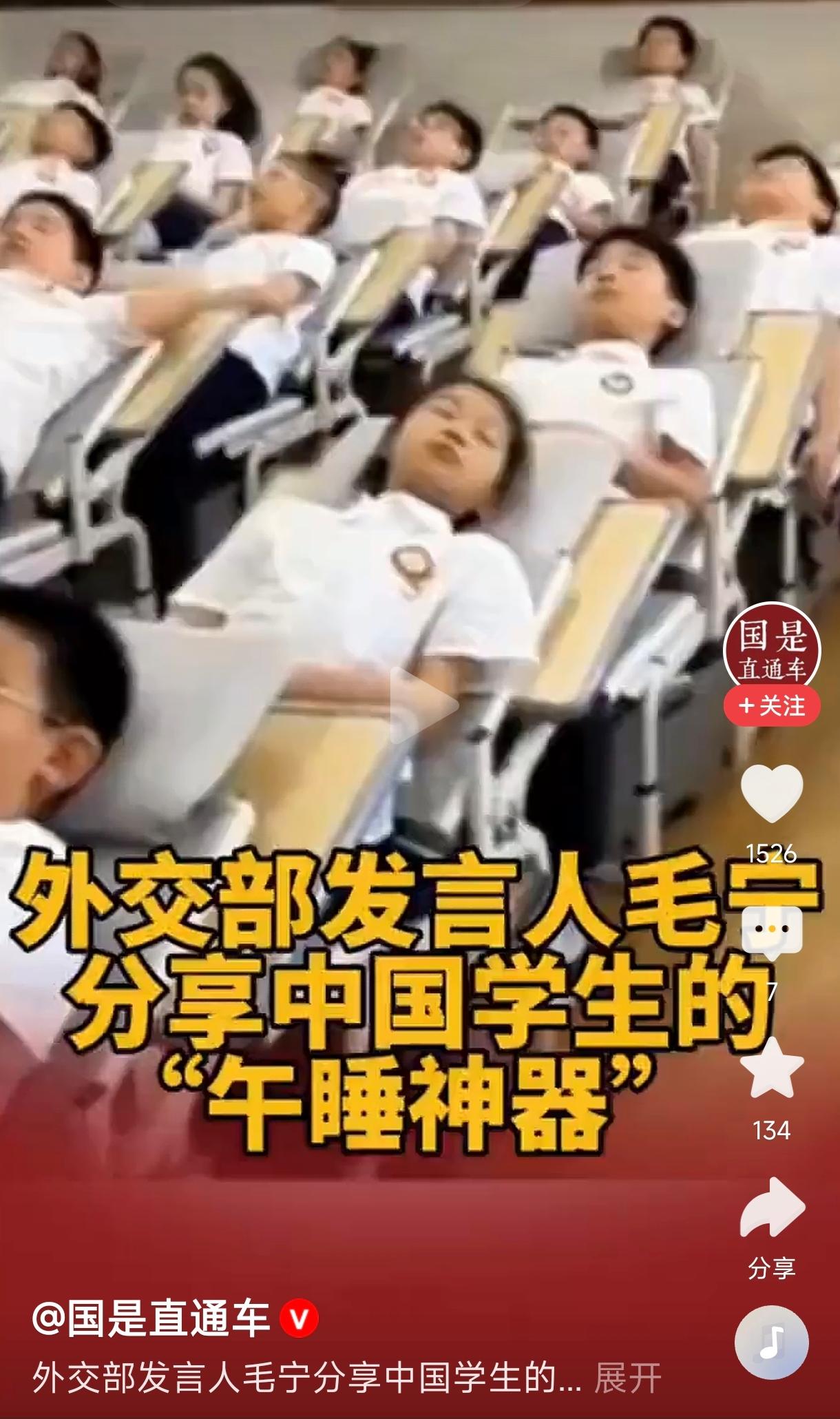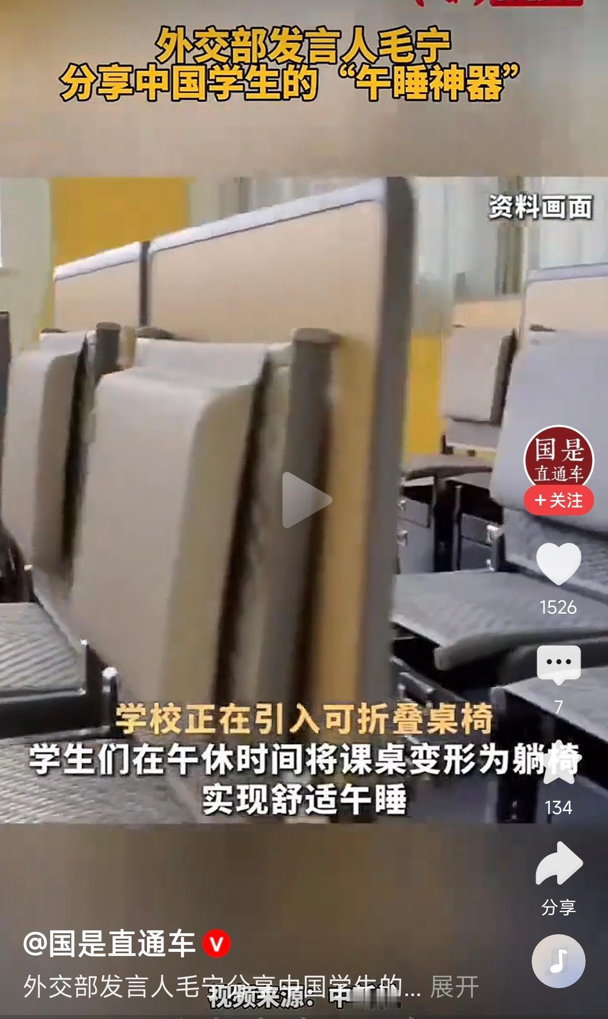 毛宁向世界分享中国学生午睡神器 外交部发言人毛宁近日分享了中国学生的“午睡神器”,引起了广泛关注。据报道,这种“午睡神器”通常指的是方便携带、使用简单的午休辅助工具,比如便携式眼罩、颈枕、甚至是带有降噪功能的小型耳机等,帮助学生在紧张的学习间隙获得高质量的短暂休息。 毛宁发言时强调,良好的午休习惯有助于学生恢复精力,提高学习效率,也体现了中国校园文化中对学生身心健康的关心和重视。这一分享不仅展示了中国学生勤奋学习的精神风貌,也体现了社会各界对青少年健康成长的支持。