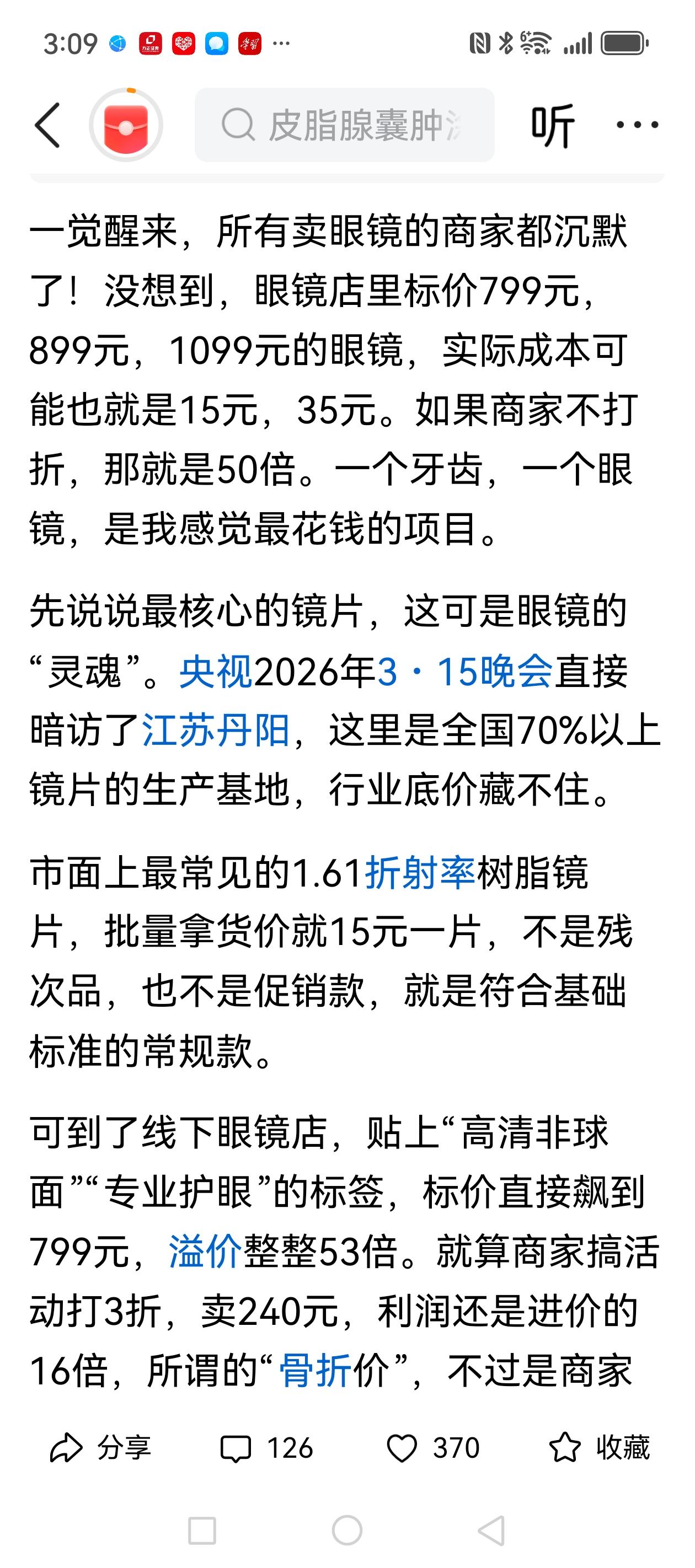 我是近视眼,需要配眼镜。谁知道眼镜店老板收款拿着百倍放大镜!看到今年3.15晚会,我去年配付眼镜,纯钛镜架,树脂防眩镜片,打6折收我1600元!谁知道成本才几十元!明天我去丹阳配眼镜,1600元高铁去高铁回,还能够吃丹阳肴肉喝杯丹阳黄酒!那个近视配镜一同出行?