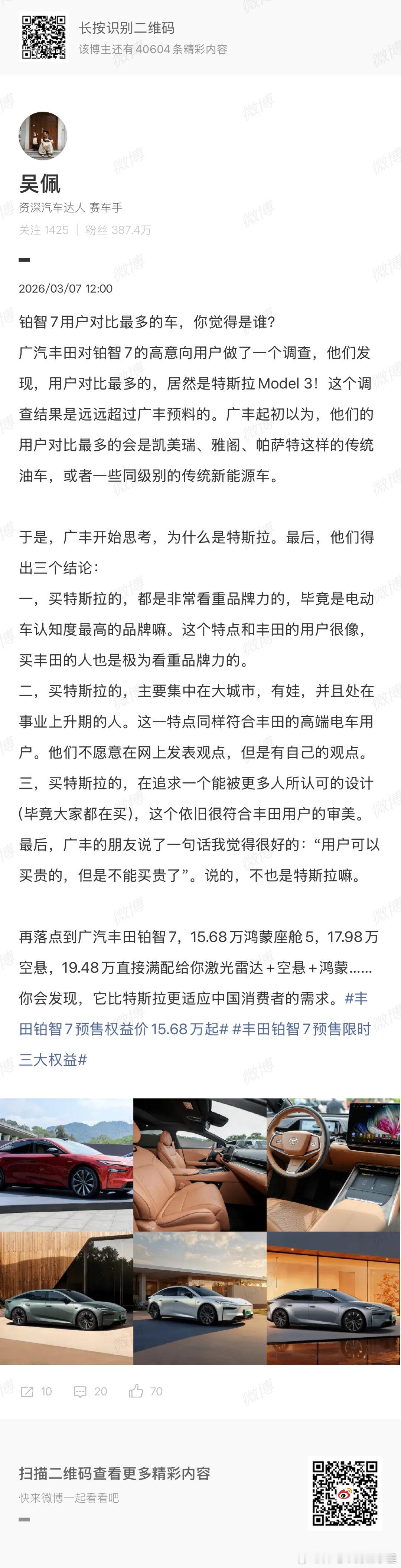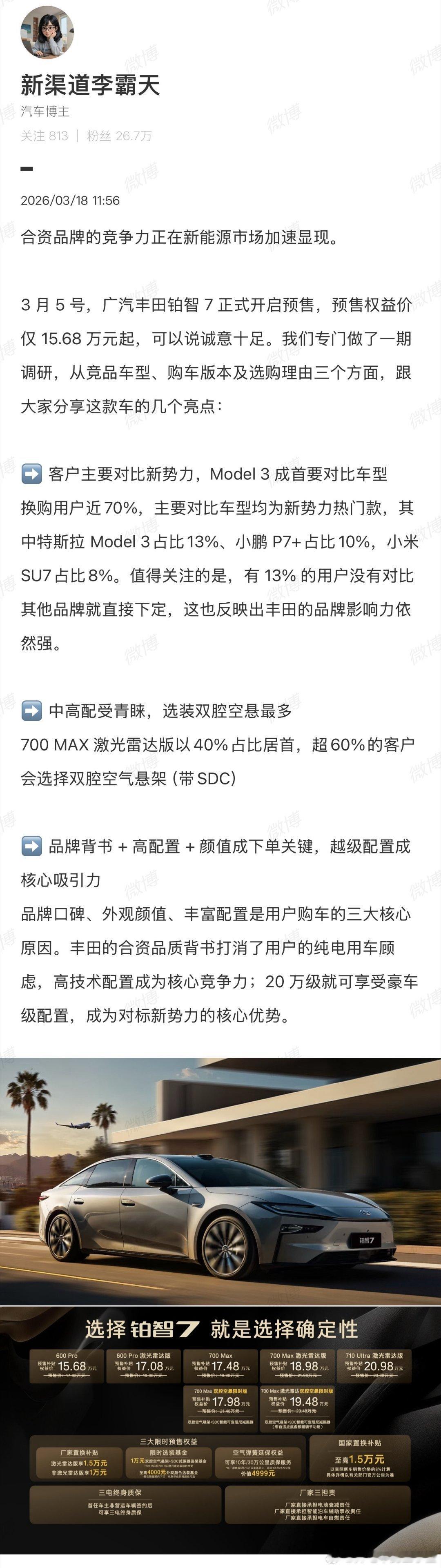 说白了,新能源卷成这样。大家赚钱也都不容易,买期货还是买现货。买不确定的新技术。还是买主流好用的现成,26年大家心里都有杆秤。,拿铂智7跟Model 3比,而是因为它们都代表了一种“确定性”。Model 3是电动技术的标杆,而铂智7是把顶级配置和丰田几十年的造车良心打包在一起。