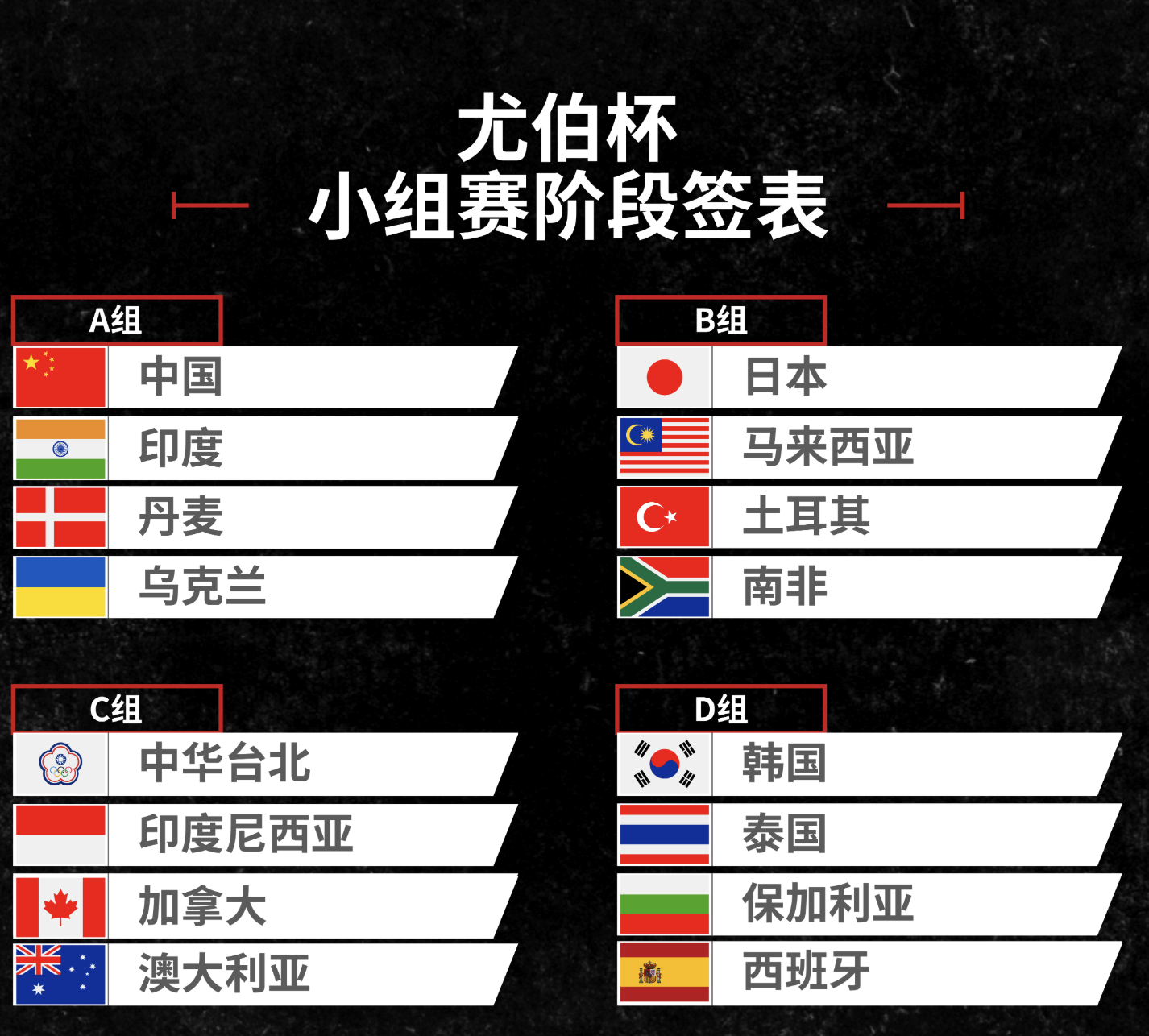【尤伯杯(女团)】A组:中国🇨🇳、印度🇮🇳、丹麦🇩🇰、乌克兰🇺🇦 B组:日本🇯🇵、马来西亚🇲🇾、土耳其🇹🇷、南非🇿🇦C组:中国台北、印尼🇮🇩、加拿大🇨🇦、澳大利亚🇦🇺D组:韩国🇰🇷、 泰国🇹🇭、保加利亚🇧🇬、 西班牙🇪🇸