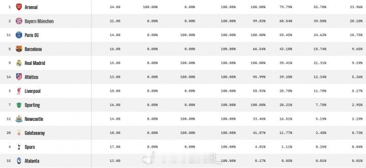 欧冠 欧冠夺冠概率↓1、阿森纳 33.96%2、拜仁 20.1%3、巴黎 10.