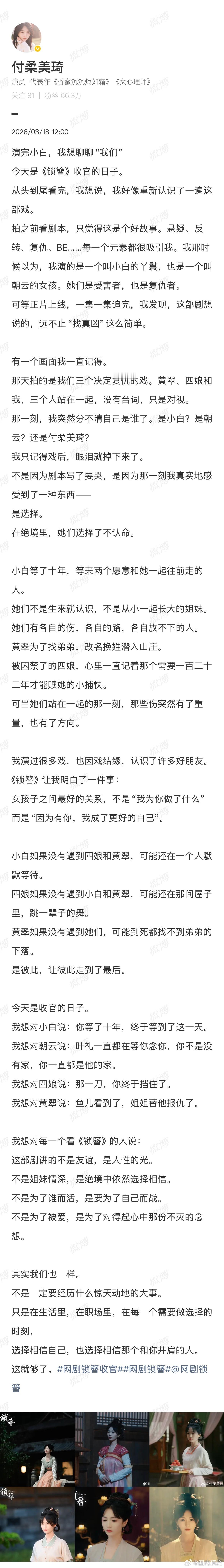 付柔美琦发文告别小白朝云随着《锁簪》收官,付柔美琦发文告别角色,满是真诚与不舍。