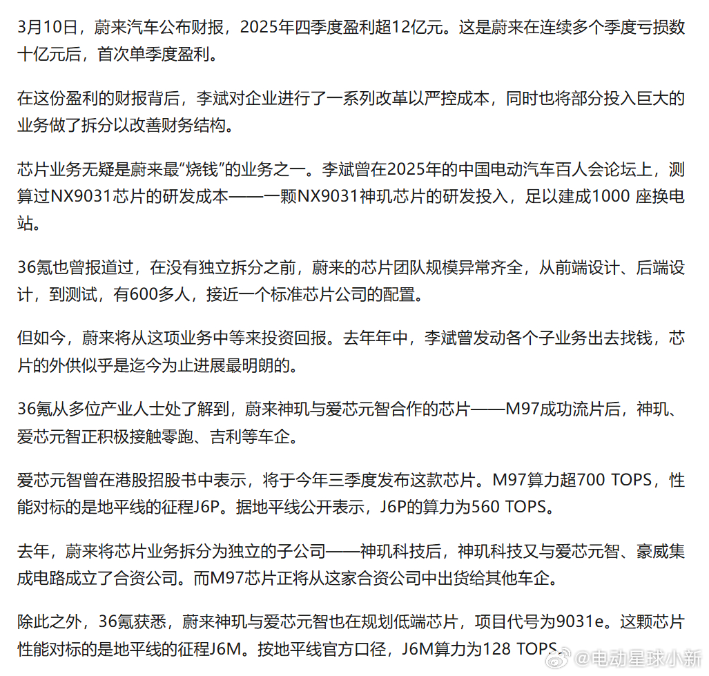 此前蔚来 NX9031 芯片研发投入超数十亿,芯片业务分拆后,既有效缓解了企业财务压力,也让蔚来自研智驾芯片实现首次外供。