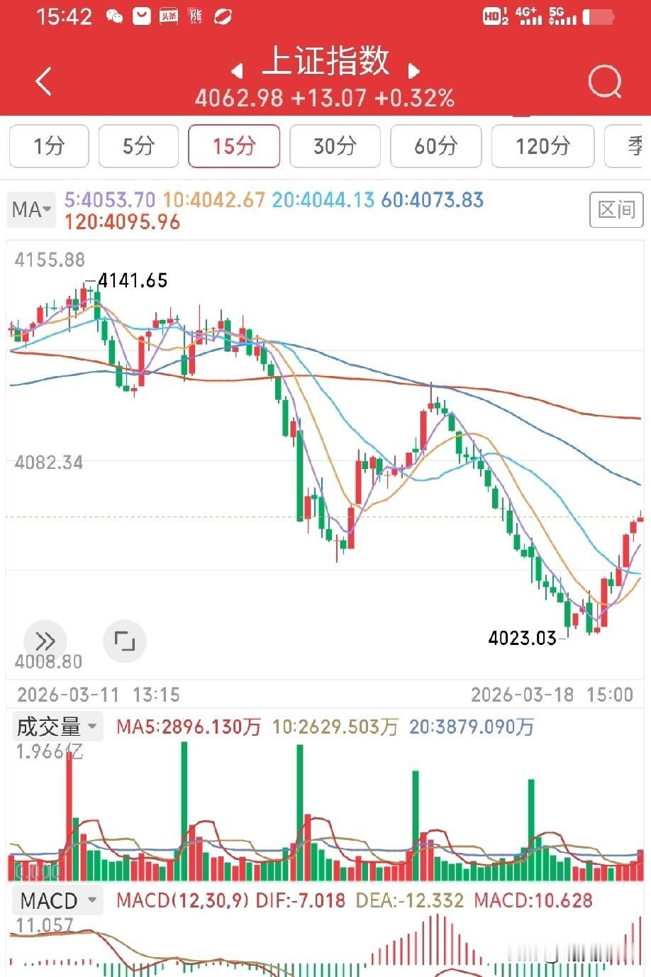 3月18日收评。事实证明,绝大部分散户只钟情于科技股,对老登股兴趣寡淡。今天科技板块一动,市场就活跃起来。量化资金精准捕捉到了这个信息,部分科技板块出现量化助攻的情况,涨停家数一下升到57家(图1)。 但是,今天的市场有一个致命的弱点,那就是成交量依然萎缩了1600亿。说明当下市场里不管是机构大资金还是散户小资金或者说游资都是相当谨慎的,在阶段底部没有实证之前,不见兔子不撒鹰。没有量能的上涨只能当反弹看!希望明天能走出一根放量中阳线,如此,本轮调整基本宣告结束,指数又要开启一轮新的箱体震荡,箱顶还是4200点。 还有一点遗憾,那就是沪指没能站上60天均线,差了7个点不到。这也从另一方面说明今天的反弹依然为弱势的超跌反抽,是李逵还是李鬼明天见分晓。 今天仓位可以上到5成,进可攻,退可守。预计,明天上午有一个冲高回落过程,从图2的沪指15分钟K线中,我们可以清楚地看到,新一轮15分钟反弹开始起浪,明天要做2浪调整,只要调整低点不破今日低点4023点,那就是加仓的最佳时机。大家可以见机行事。一定要做好分批进场的功课,赌性不能太重。 个人观点,不构成投资依据,不喜勿喷。祝大家明日好运。
