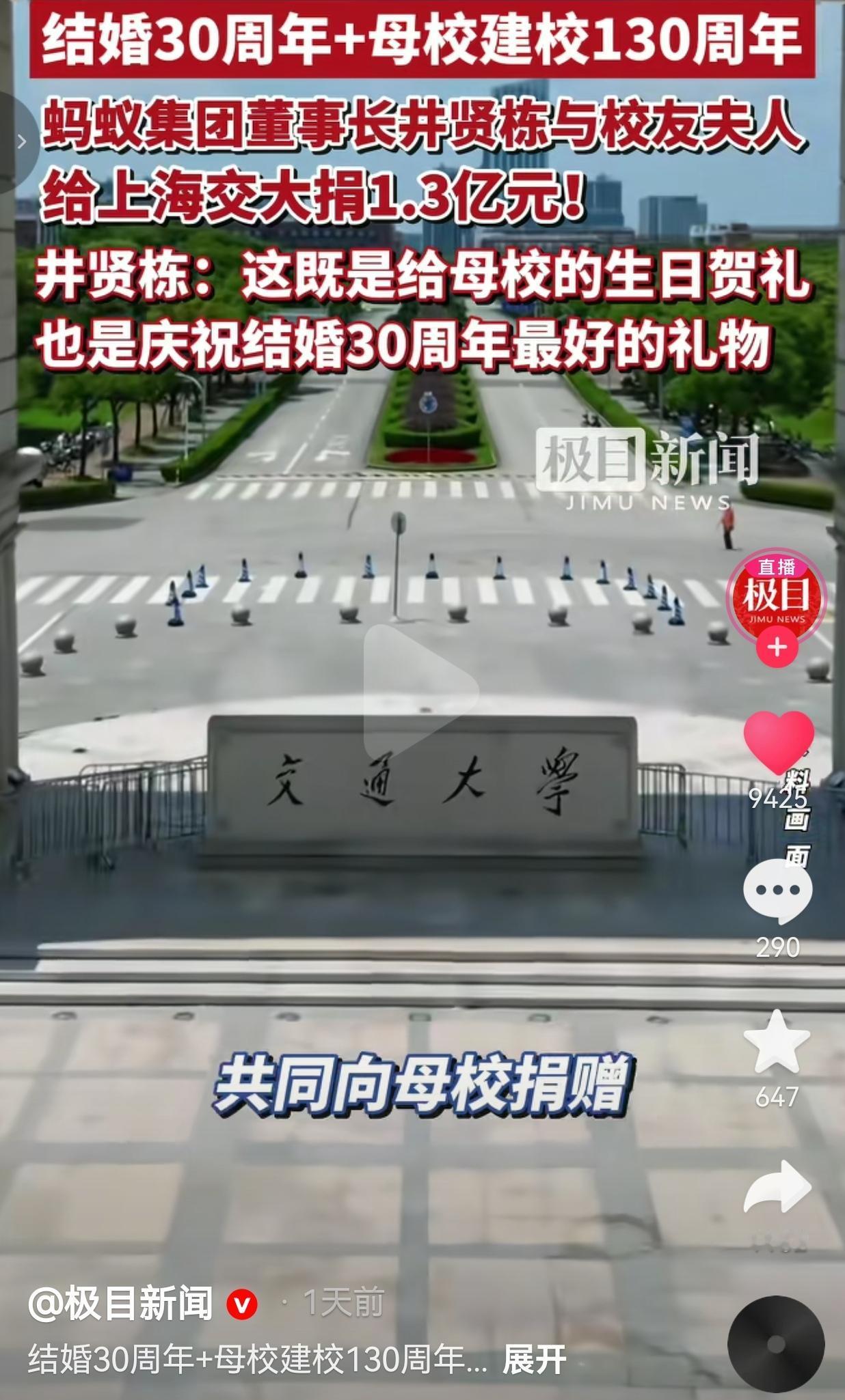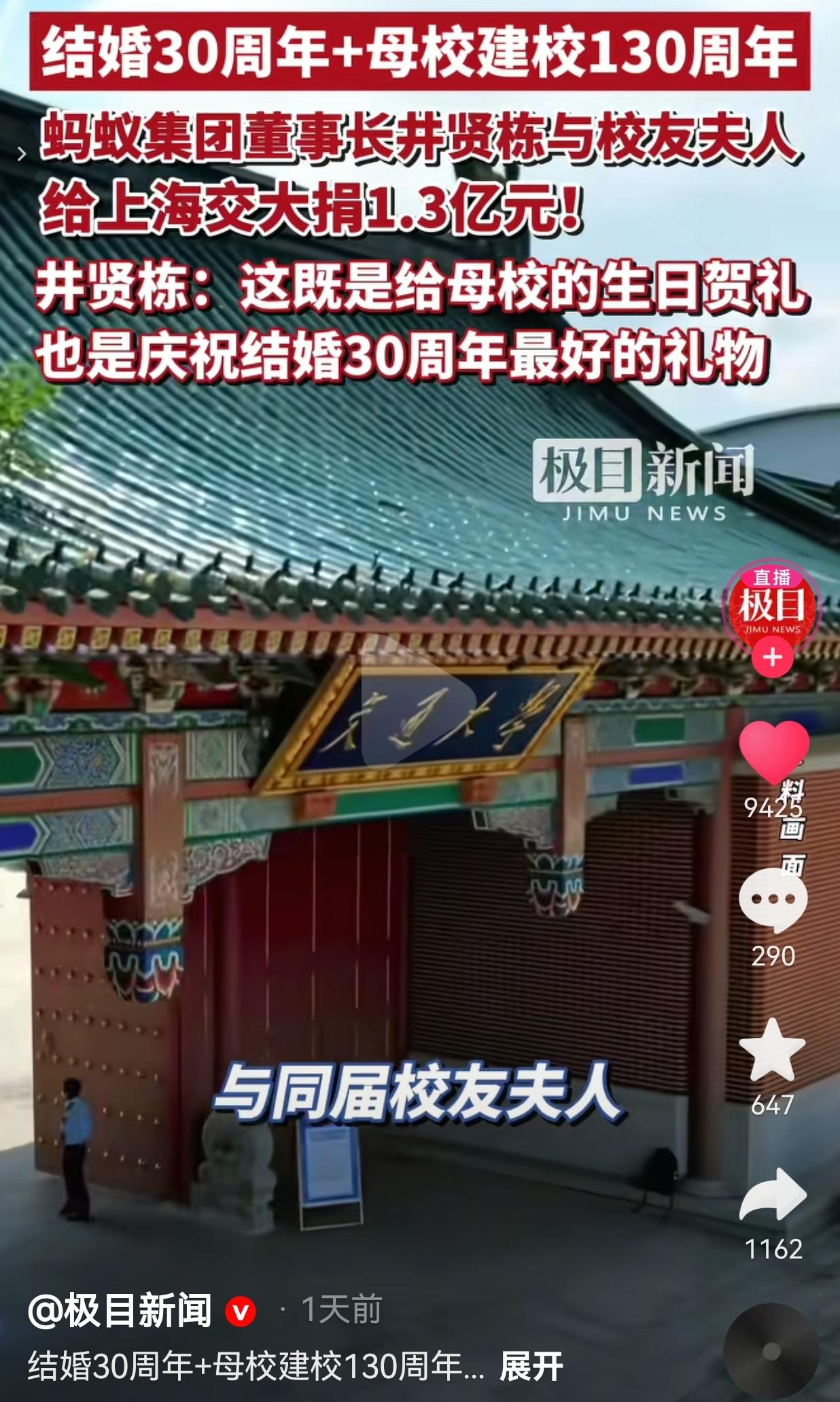结婚30年捐1.3亿给母校!这才是顶级浪漫! 近日,蚂蚁集团董事长井贤栋,和同是上海交大校友的老婆,在结婚30周年+母校130周年的日子里,一把捐出1.3亿,还是现金+股份,全砸进了“AI未来基石基金”! 你没看错,不是买包买表,不是环球旅行,是把半辈子的家底,捐给了他俩爱情开始的地方。 他俩是交大94届同届校友,从校园里的青涩牵手,到后来一起打拼事业,再到如今功成名就,愣是把“从校服到婚纱”的故事,活成了“从校园到反哺”的传奇。 井贤栋自己都说:“这既是给母校的生日贺礼,也是庆祝我们结婚30周年最好的礼物。” 网友看到后评论说:“我结婚3周年连个520红包都要讨价还价,人家30周年直接捐1.3亿…人和人的差距,比我和马云的还大!” 也有的网友说:“别再说“有钱人才有浪漫”,这哪是浪漫,是把“感恩”和“相守”刻进骨子里了!换作是你,能舍得把半个亿捐出去?” 还有的网友说:“当年在交大食堂一起啃包子的情侣,现在给母校盖楼了…这才是真正的“饮水思源”! 看完这件事,我心里真的五味杂陈,半天缓不过来。 我们普通人的日子,大多是柴米油盐,结婚纪念日可能就是一顿饭、一束花、一句祝福,别说捐几个亿,就算是拿出几千块做公益,很多人都要犹豫半天。我们总觉得,浪漫就是仪式感,幸福就是吃好穿好,日子过好自己的就行。 可井贤栋夫妇这一举动,真的给我们上了最扎心、也最温暖的一课。 他们不是在炫富,不是在作秀,是真的记得从哪里来,和谁一起走。 记得母校教过自己的知识,记得当年一起吃苦的彼此,记得自己站得高了,也想拉后来的年轻人一把。这种浪漫,比任何奢侈品都贵重;这种感情,比任何甜言蜜语都长久。 我特别感慨,现在太多人过得太“精”了:谈恋爱只算利弊,结婚只看条件,有钱了只顾自己享受,对母校、对家乡、对陌生人,连一点善意都舍不得给。夫妻之间吵吵闹闹,为钱斤斤计较,过着过着就忘了初心,忘了当初为什么在一起。 可你看人家,携手三十年,没有被名利冲昏头,没有被财富改变本心,反而把最珍贵的东西,送给了最有意义的地方。最好的夫妻,从来不是一起享受多少,而是一起创造多少、回馈多少。 我们这辈子大概率赚不到1.3亿,也做不出这么大的善举,但我们能学的,是那份真心、感恩、相守。 对伴侣多一点包容,少一点算计;对帮助过自己的人多一份惦记,少一份遗忘;对这个世界多一点善意,少一点冷漠。 真正的高贵,从来不是钱多钱少,而是你心里装着别人; 真正的浪漫,从来不是礼物多贵,而是有人陪你一起,做照亮别人的光。 这才是最让人羡慕、也最值得我们深思的人生啊。 对此,你怎么看?