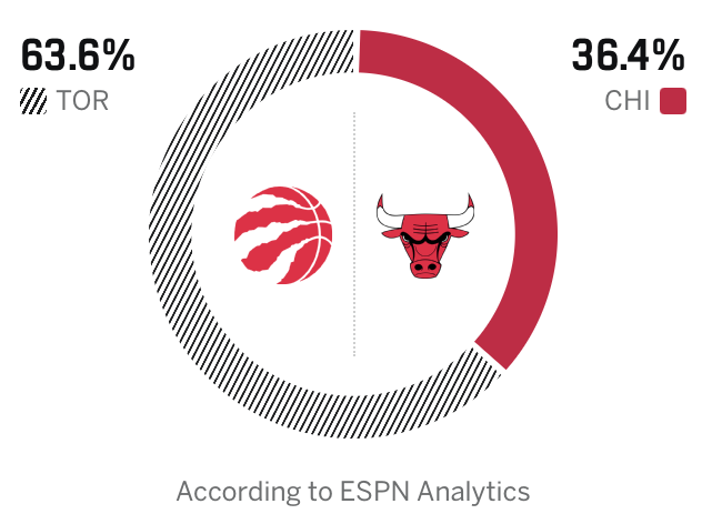 ESPN预测猛龙vs公牛:猛龙胜率63.6%,公牛胜率36.4%