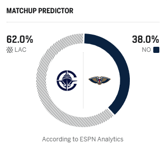 ESPN预测明日比赛:鹈鹕胜率38.0%,快船胜率62.0%