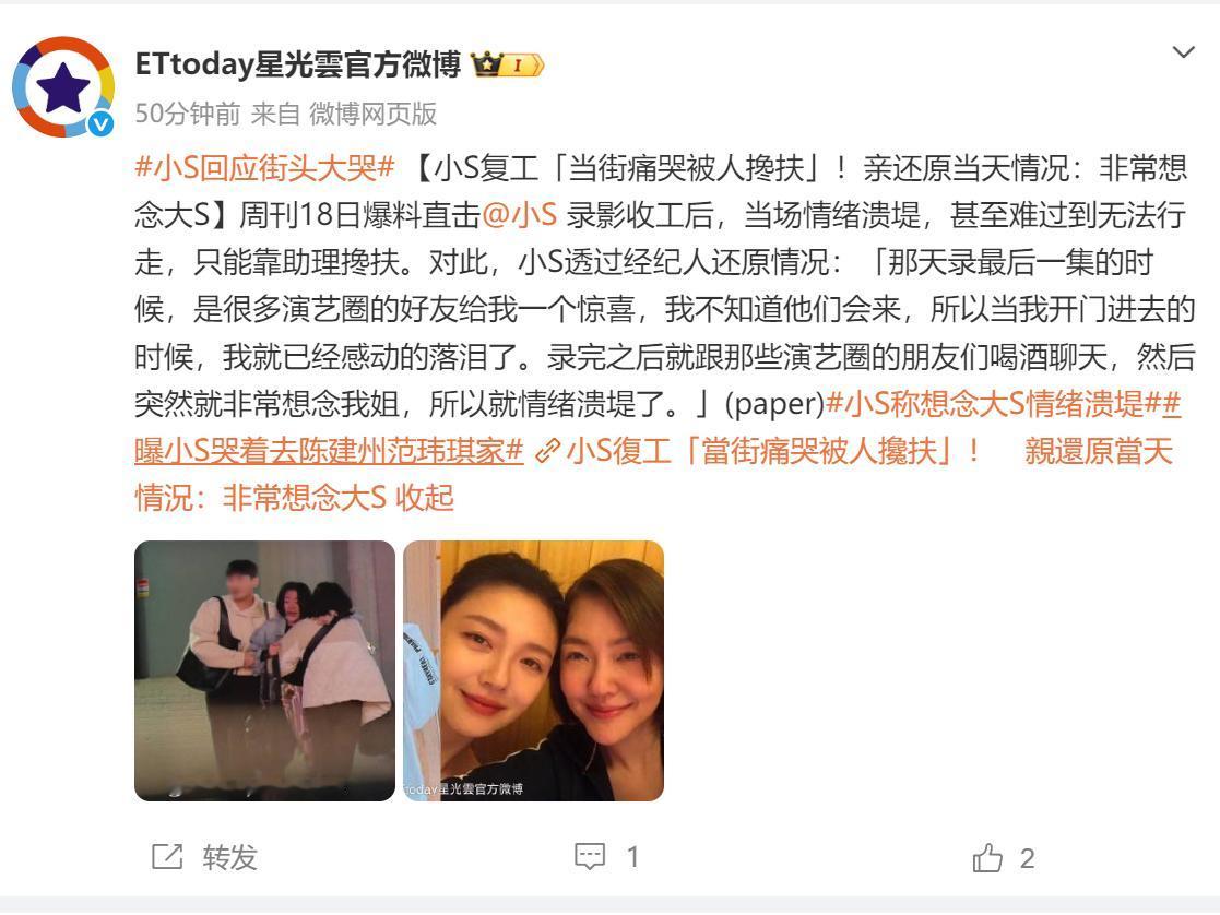 小S回应街头崩溃大哭:是想我姐了,网友不买账。 3月17日晚,录完节目的小S,喝醉后在街头嚎啕大哭,然后不愿回家要去陈建州和范玮琪家,这件事一度登上热搜。 3月18日,小S通过经纪人回应,当天节目录制结束后,很多演艺圈的同行给了她一个大惊喜,然后大家一起喝酒聊天,聊着聊着就想起了大S,情绪上来后一下没控制住。 大S去世后,小S停工一年调整状态,最近好不容易复出,和友人在一起聊天时免不了会聊起好的状态,想起大S也在情理中,但网友似乎并不买账。 有网友说,不排除她是想大S,但有家不回却去陈建州家,则不像是仅仅想大S这么简单。 谁都知道,许雅钧最近出了什么事,小S在想到大S时,免不了会想起她老公那几乎无底线的操作,这恐怕才是她大哭的原因。 小S一直视大S为靠山,小S如今能在娱乐圈混得风生水起,大S有一大半的功劳,不管是从姐妹感情还是利益方面,大S的去世对小S来说都是巨大的损失,在她最伤心痛苦的时候,许雅钧却时刻想着撩妹,这让她怎么不心寒。 面对好友的关心,她在人前只能笑脸相待,可在人后,她的委屈和痛苦却需要找一个发泄的地方,大S没了,许雅钧令他心寒,她不想回家,只有去找最亲密的朋友了,也实在是可怜。 让网友不满的是,小S现在无论什么事,都会扯上大S,因为只要提到大S,大家就会对她格外宽格,不管什么错都能原谅,而她也好像也尝到了这个甜头,越发用得多了。