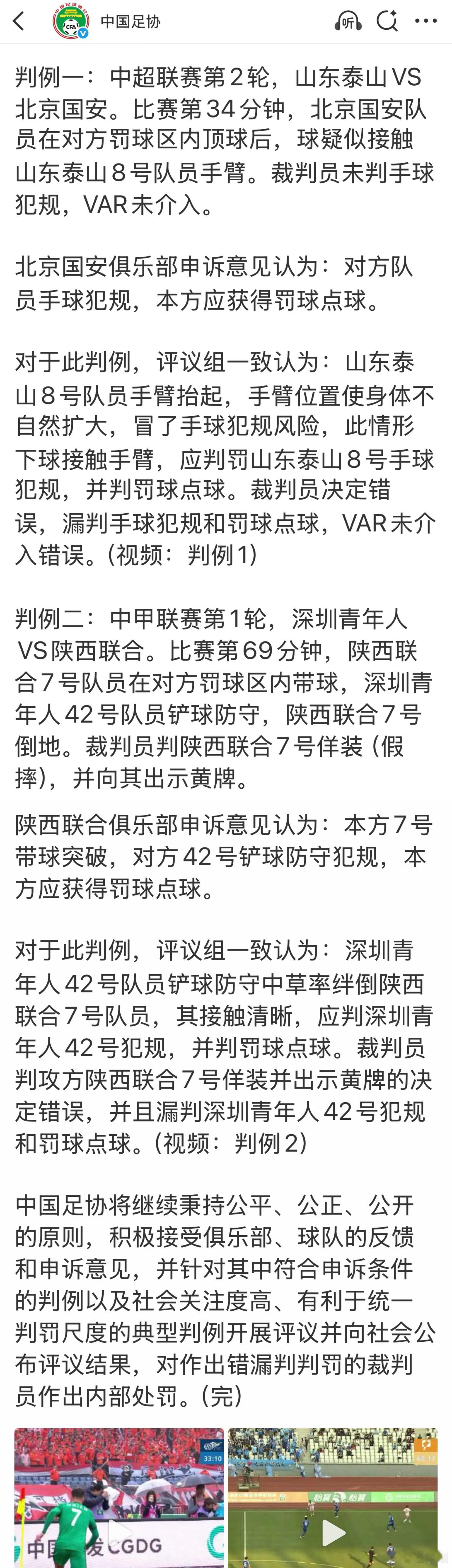 中超第二轮之后,有了新赛季第一次裁判评议,两个案例,一个中超一个中甲,评议最终都认定漏判了点球。