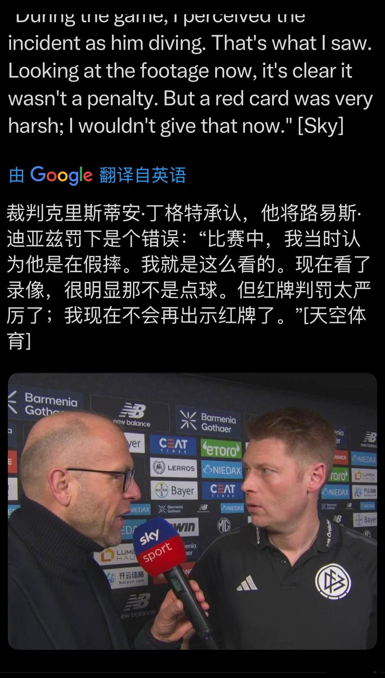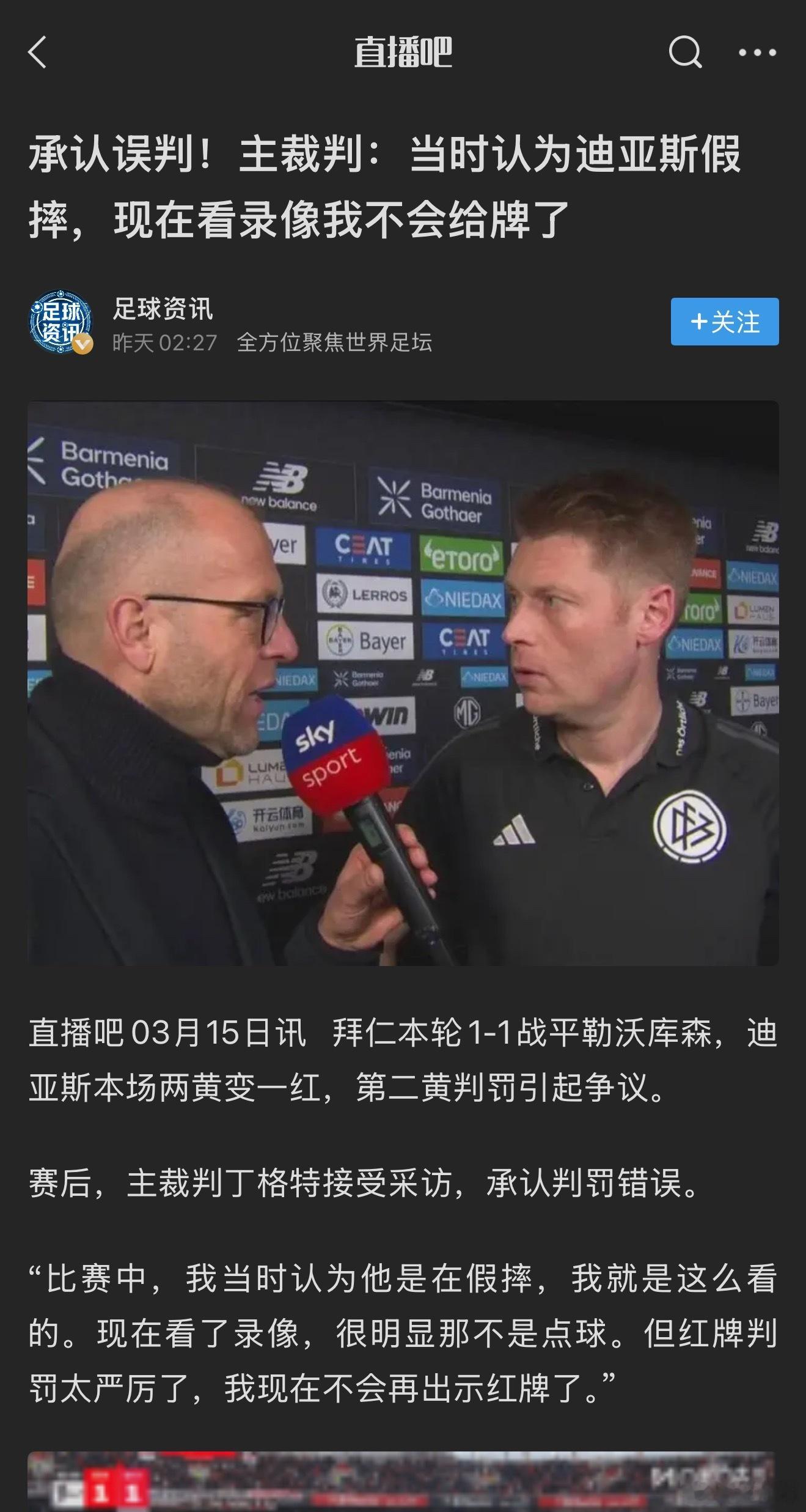 无独有偶,德甲上轮拜仁与勒沃库森的比赛,也有个迪亚斯两黄变一红的判罚,迪亚斯的第二黄是因为裁判认为他假摔。根据天空体育的报道(图三)(图四),当值主裁判丁格特赛后非常坦率地承认,在看过录像后,他已经意识到自己在比赛中做出了错误的判罚。从上轮中超申花和浙江比赛回放画面来看(图六),卢卡斯右手已经推到了杨皓宇身体,主裁判判杨皓宇假摔第二黄变红牌罚下,是否属于一次过于严厉的判罚?