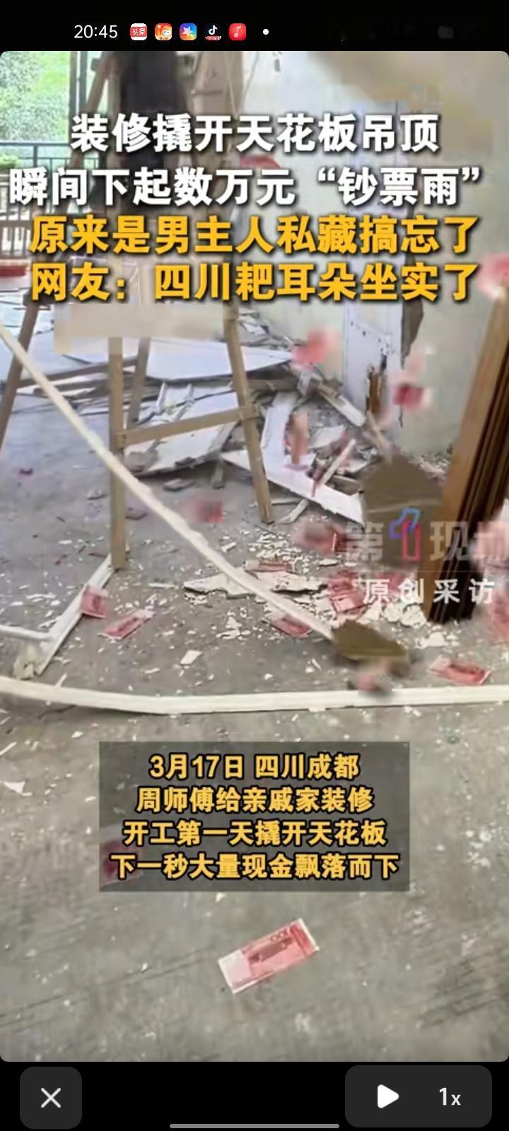 装修第一天直接 “天降现金”,藏私房钱藏到自己都失忆,简直是现实版惊喜盲盒 3月17日,四川成都。周师傅给亲戚家装修,开工第一天撬开天花板,下一秒大量现金飘落而下。原来,因为亲戚家小孩比较多,家里没有保险箱,男主人便把两万元现金藏在吊顶里,重新装修时已经忘得一干二净,在四川,耙耳朵很流行放私房钱,目前已将钱还给主人。 钱藏着藏着就成了遗产,这要是遇上装修师傅还真没人知道,两万块完璧归赵。成都耙耳朵这波操作,又好笑又真实。