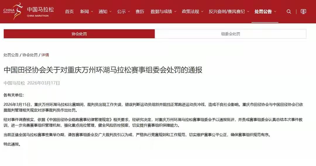 万州马拉松赛场掀起风波,冠军选手盛雪李在冲线关键时刻被裁判意外拦阻,致使胜利瞬间受阻,舆论瞬间引爆。面对质疑,官方果断出手,裁判停赛期从一年加码至两年,组委会亦遭严肃通报。这不仅是对失误的严厉追责,更是捍卫体育精神与公平竞技的坚定表态。