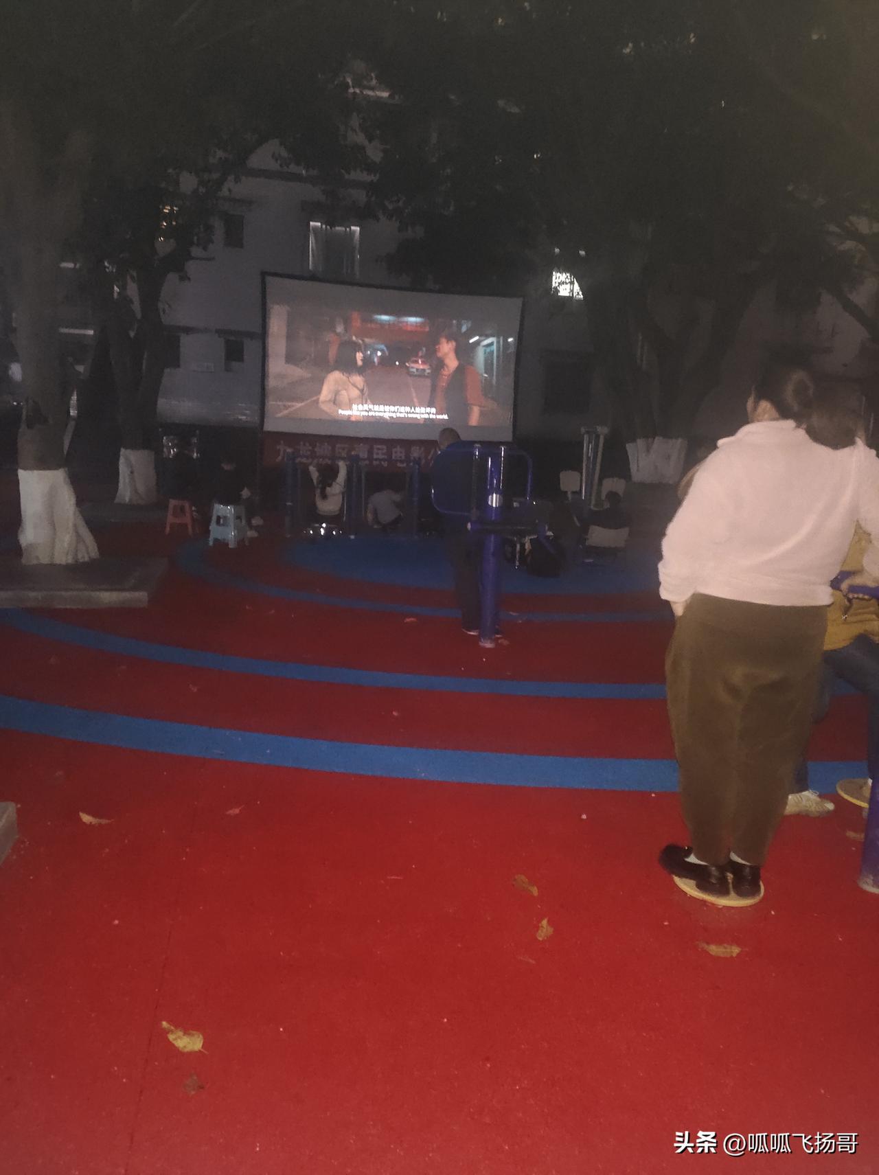 吃完饭下楼丢垃圾, 竟然发现小区在放映电影。 时代真不一样了 , 回想小时候哪个村有电影,提前几天都会知道 , 天还没有黑 , 四面八方赶来看电影的人早就站满了广场, 来的晚的只能站在银幕后面反着看 。 现在小区里放电影,我竟然不知道 。 看看这电影还有谁在看 , 稀拉拉的几个人 , 就那几个人也没怎么看, 都在聊着天。 我看了一下电影下面的横幅, 原来是惠民公益电影免费放 。 我停留了一会 , 完全没有看下去的兴趣, 丢了垃圾就回去了 。 这样放电影真没多大意义, 纯粹浪费电,因为没几个人看。