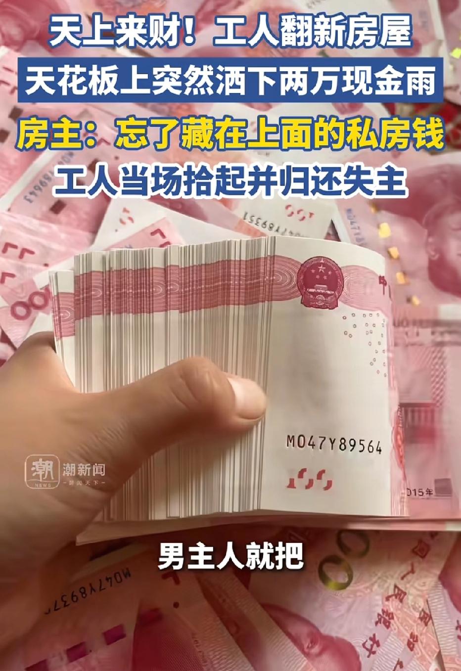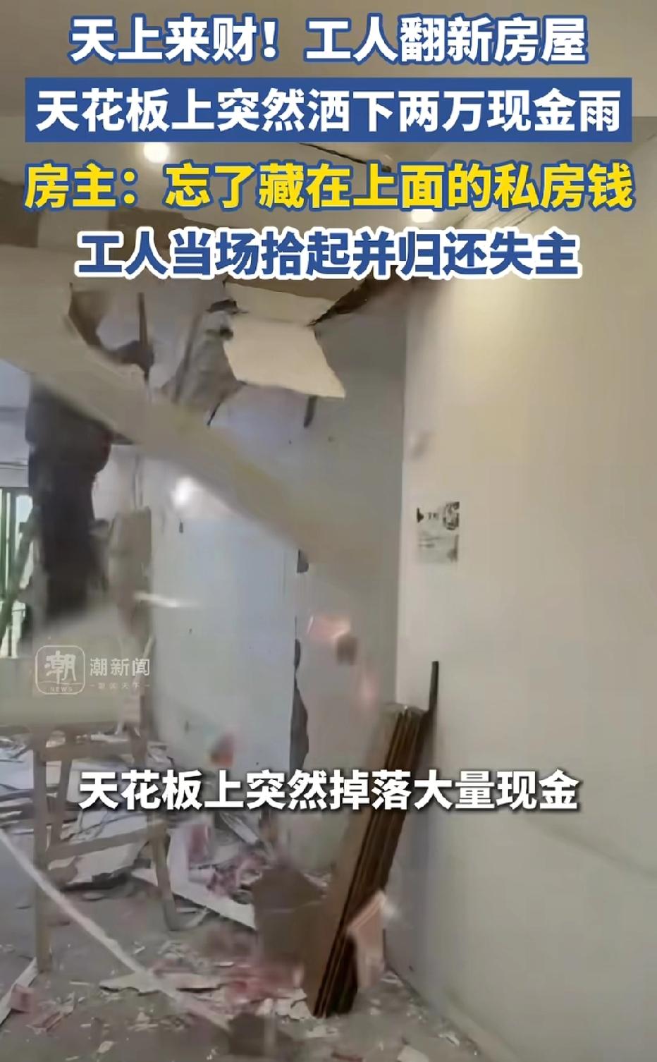 天上来财!四川,男子帮亲戚翻新二手房,他将天花板的吊顶撬开,没想到,2万多现金洒了一地,男子傻眼:这么多私房钱。亲戚一拍大腿表示,我都忘了藏了这么多钱,家里来的人比较多放上面安全。男子已将现金交给亲戚。网友炸锅了。 周师傅从事装修工作多年,这次他接手的是自家亲戚的二手房子。 他想着都是自家人,干活更用心,没想到一锤子下去,竟砸出了亲戚隐藏多年的秘密。 当天,亲戚全程在现场盯着施工,想着早点完工入住。 按照流程,周师傅需要拆除老旧的天花板吊顶,重新装修。 他手持工具,小心翼翼地撬动吊顶板材,只听“哗啦”一声巨响,一沓沓用塑料袋裹着的现金突然从缝隙里倾泻而出,红彤彤的钞票瞬间散落一地,铺满了半间屋子。 这突如其来的一幕,让在场两人都惊呆了。 周师傅手里的工具瞬间停在半空,眼睛瞪得老大,看着满地现金,当场脱口而出:“我的天!这么多私房钱?你藏得也太隐蔽了吧!” 一旁的亲戚更是脸色骤变,从惊讶到慌乱,再到尴尬,短短几秒内表情变换不停,站在原地手足无措,恨不得找个地缝钻进去。 被周师傅这么一问,亲戚当场拍大腿解释。 原来,亲戚家里一直没有买保险柜,平时家里来往人员又多,亲戚朋友、工人师傅时不时会上门,把现金放在抽屉、柜子里总觉得不放心。 思来想去,他觉得天花板吊顶最隐蔽,一般没人会动,便把两万多块钱悄悄藏在了上面。 时间一长,自己忙起来竟彻底忘了这事,要不是这次装修拆吊顶,这笔钱还不知道要藏到什么时候。 面对这笔意外出现的巨款,周师傅没有丝毫贪念。 他知道,这是亲戚辛辛苦苦攒下的钱,藏在这里也是出于安全考虑,虽然方式让人哭笑不得,但绝不能占为己有。 他当场蹲下身,和亲戚一起,一点点将散落的现金捡起来,仔细清点核对,一分不少地全数交还给亲戚。 整个过程,两人都在现场,没有任何隐瞒,也没有丝毫犹豫。周师傅的坦荡,让原本尴尬的亲戚松了一口气,连连道谢,感叹自己找对了人。 这件事被传到网上后,立刻引发网友热议,评论区直接炸锅。 有人调侃:“藏得再深,也躲不过装修师傅的一锤子!当着亲戚的面曝光私房钱,这尴尬程度直接拉满!” 更多人则为周师傅点赞:“人品过硬,拾金不昧,熟人之间更显良心!” 也有人提出质疑:“要是亲戚不在,是不是占为己有?” 《民法典》第314条规定:拾得遗失物,应当返还权利人。拾得人应当及时通知权利人领取,或者送交公安等有关部门。 本案中,亲戚因疏忽遗忘在吊顶内的现金,属于法律上的遗忘物,周师傅作为发现人,负有法定的返还义务。 《民法典》第316条规定,拾得人在遗失物送交有关部门前,应当妥善保管遗失物;因故意或者重大过失致使遗失物毁损、灭失的,应当承担民事责任。 周师傅不仅当场归还,还协助清点整理,尽到了妥善保管和及时返还的法定义务。 如果周师傅心生贪念,拒不归还,数额较大的情况下,还可能涉嫌《刑法》中的侵占罪,需要承担相应的刑事责任。 而他当场归还的做法,既守住了道德底线,也严格遵守了法律规定,用实际行动诠释了诚信为本。 金钱固然诱人,但良心和底线,才是一个人最宝贵的财富。同时也提醒大家,大额现金尽量存入银行,既安全又放心,别再用这种容易“意外曝光”的方式藏钱了。