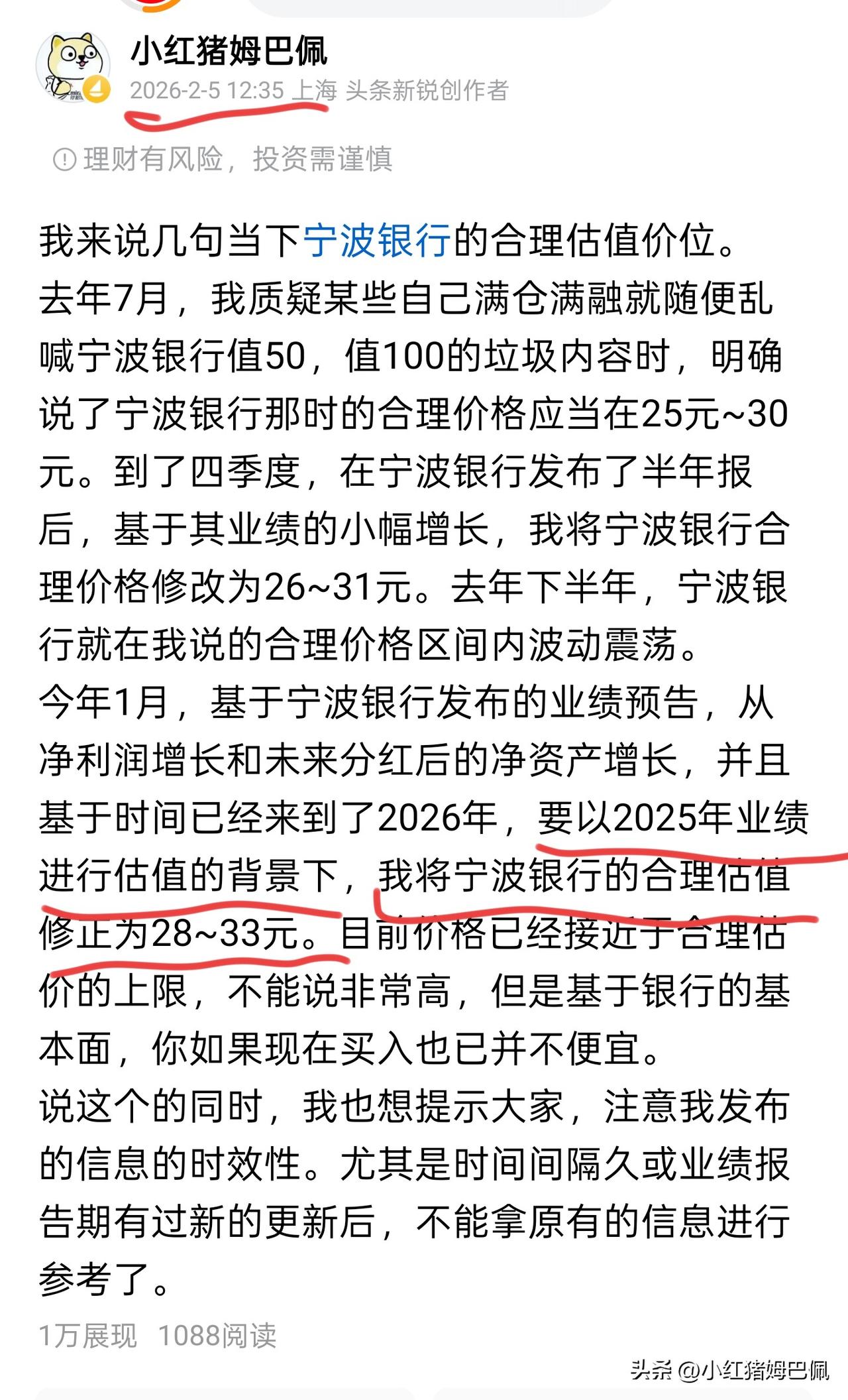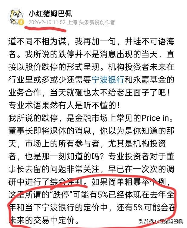 互联网有时候就是一个“博导教小学生知识,小学生听不懂说博导水平一塌糊涂”的地方。 我们再来一起回顾一下“小博主”对于宁波银行近期的估值判断和管理层更替的影响说法。2/5和2/10的两次发帖解读,基本的判断都是八九不离十的。 我不实名,是因为不实名更方便我说我想说的,说一些实话,说的话不要被误解为代表了XX机构的观点;我不实名,是因为我希望你因为我内容的价值和出彩点认可我,而不是被我在金融圈响当当的抬头和职务吸引。 千万千万别信我,我废柴一个,我是一个“1500元推寒武纪”、“宁波前期接近33元左右时说管理层更替宁波要暴跌”的“小博主”![灵光一闪][灵光一闪][灵光一闪]