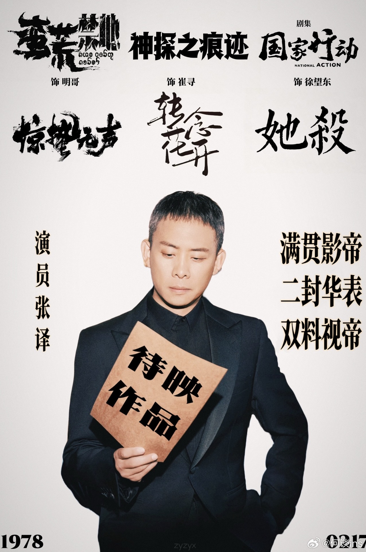 演员张译待映作品影《神探之痕迹》陈思诚导演,饰崔寻(崔道植)影《转念花开》贾玲导演影《蛮荒禁地》曹保平导演 饰明哥影《她杀》曹保平导演 客串剧《国家行动》 饰 徐望东