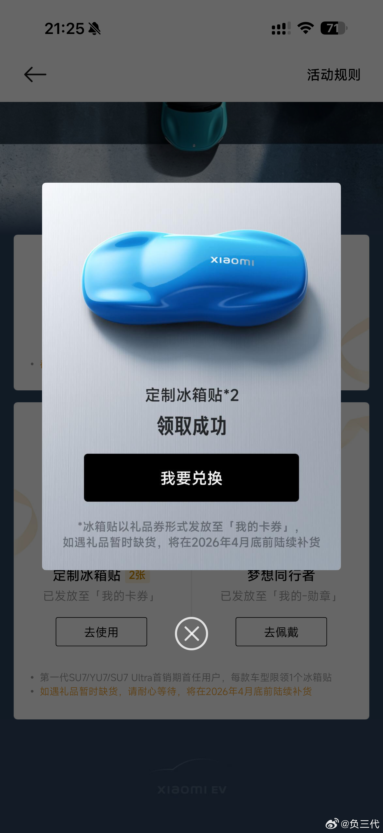 小米汽车两周年,我买过SU7 Max创始版和SU7 Ultra,所以领了两个冰箱贴