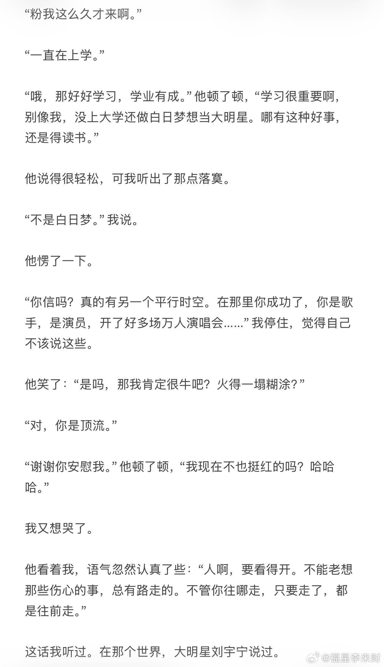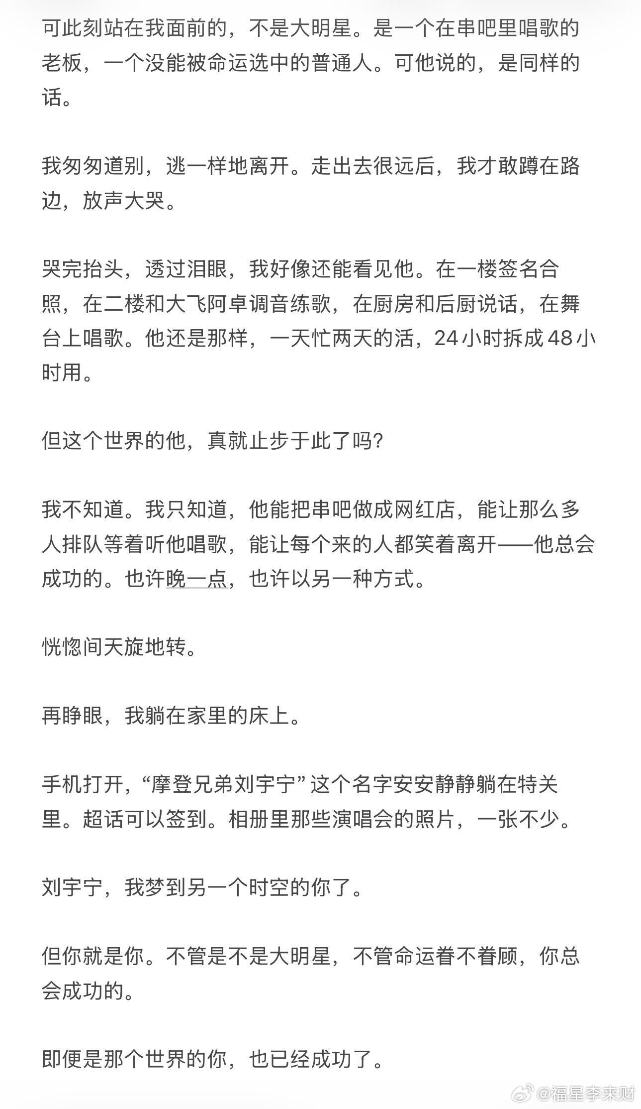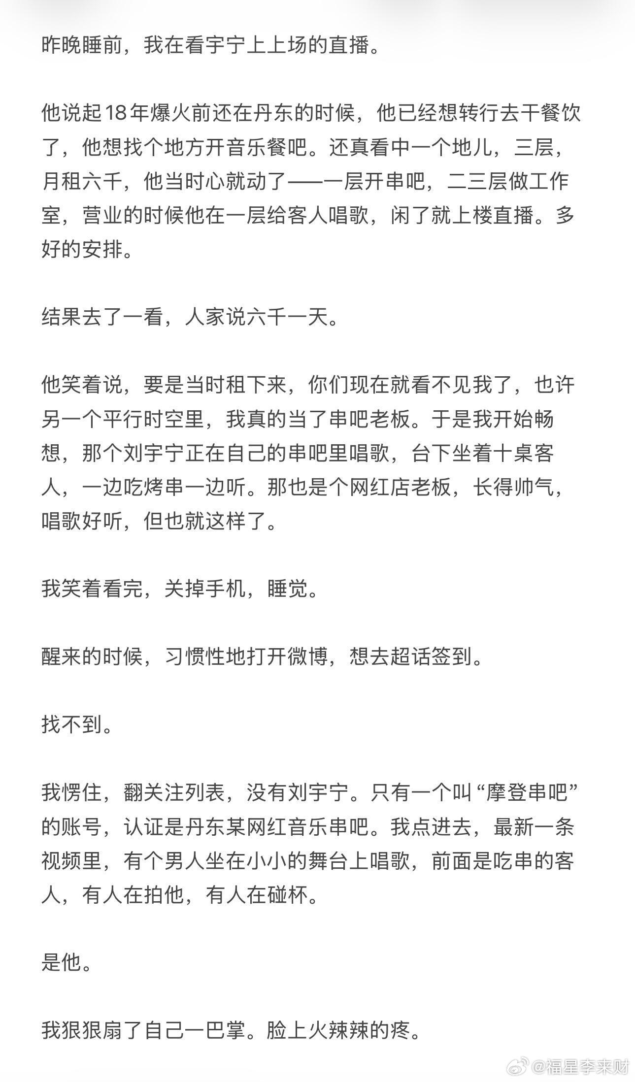 如果当初他真的开了音乐串吧……昨晚看刘宇宁上上场直播聊到出道前租房子的事,他说如果当时6000一天是真的,你们现在可能就看不到我了。也许另一个时空里刘宇宁真的在当串吧老板。