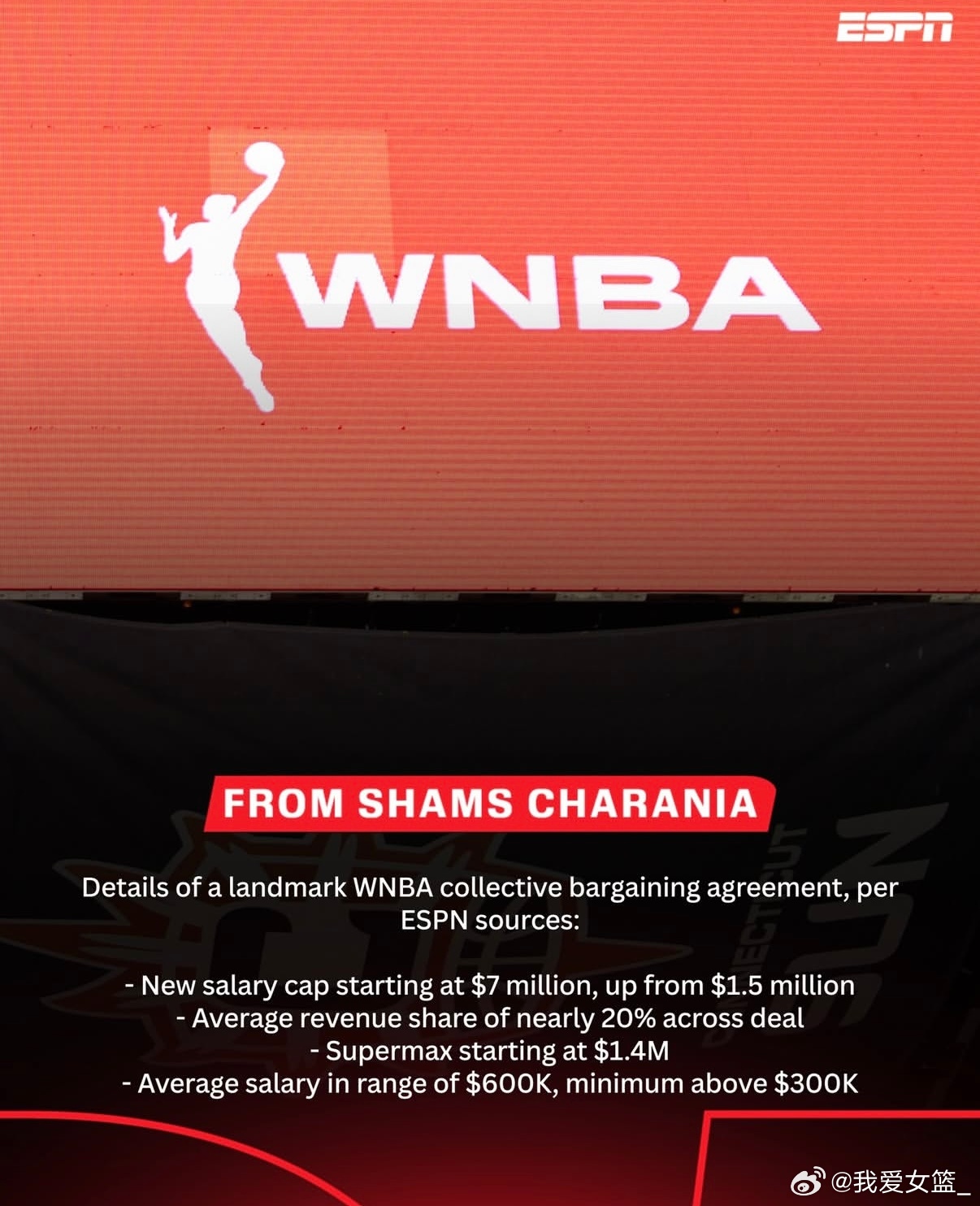 【WNBA新劳资协议达成,工资帽大幅提升】据知名记者Shams报道,WNBA已达成新的劳资协议,工资帽将从150万美元大幅提升至700万美元。根据协议,未来几年内球员的平均收入分成接近20%,超级顶薪起薪将达到140万美元,球员平均薪资约为60万美元,最低薪资也将超过30万美元。这是该协议首次将工资制度与收入增长挂钩,这意味着WNBA 球员的薪资将大幅提升。WNBA