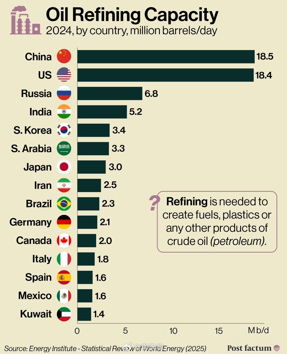 中国🇨🇳 1850万桶/日,中国拥有全球最大炼油系统。