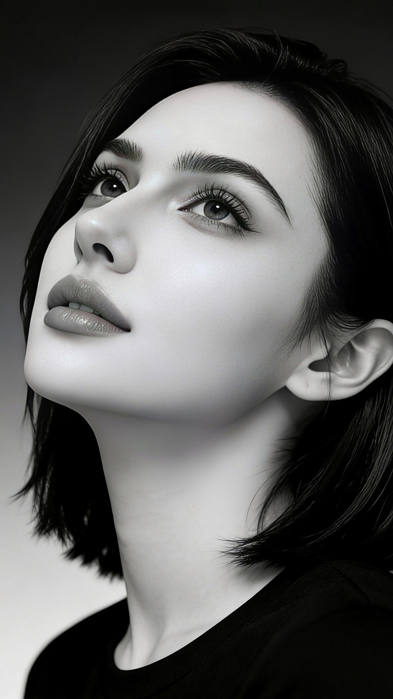 九帧灰调定格知性美。乌发利落如墨,眼波藏星,眉峰清冽,唇染淡雅。黑衣衬得颈线如诗