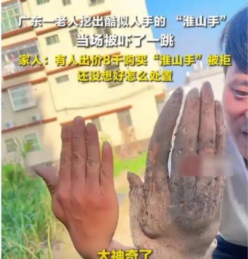 “吓一跳!”近日,广东揭阳,一老人在自家菜地里挖淮山,不料,挖着挖着突然看见地里出现“一只手”,这把老人吓得不轻,等她冷静后仔细查看,才发现这其实是酷似人手的淮山,不少人都想出高价买下,但都被拒绝了!网友:稀罕物啊! 谁能想到,土里刨出来的不是金银,竟是一只栩栩如生的“淮山手”!五指分明、连“指甲盖”都清晰可见,刚出土时还带着粉嫩的色泽,老人当场腿都软了,以为挖到了什么吓人东西,缓了半天才敢凑近细看。 这片菜地老人种了几十年,三十多根淮山全是笔直规整,唯独这一根长成了“人手”模样,堪称万里挑一。视频发到网上瞬间炸锅,猎奇的、求看的、想收藏的蜂拥而至,更有人直接出价8000元求购,放话要当奇珍摆件。 换作旁人,八千块到手直接变现,可老人一家偏偏摇头拒绝。他们说,这不是什么天价宝贝,是大自然送的小惊喜,比起卖钱,更想好好保存、做成标本留个纪念。 专家一句话点破真相:异形淮山只是土壤、石块挤压形成的自然造型,营养口感和普通淮山没区别。可网友依旧热议:不是钱的事,是这份难得的缘分与趣味。 有人笑说“淮山成精了”,有人感慨“平凡生活里的小神奇最动人”,也有人佩服一家人不被高价打动的淡然。 生活本就平淡,偶尔撞见这样的小意外,才更觉温暖有趣。比起一夜暴富,守住这份天然的欢喜,才更珍贵。 你觉得这根“淮山手”该卖还是该留?换作是你,会怎么选?评论区聊聊~佛手铁棍山药 土货野生山药