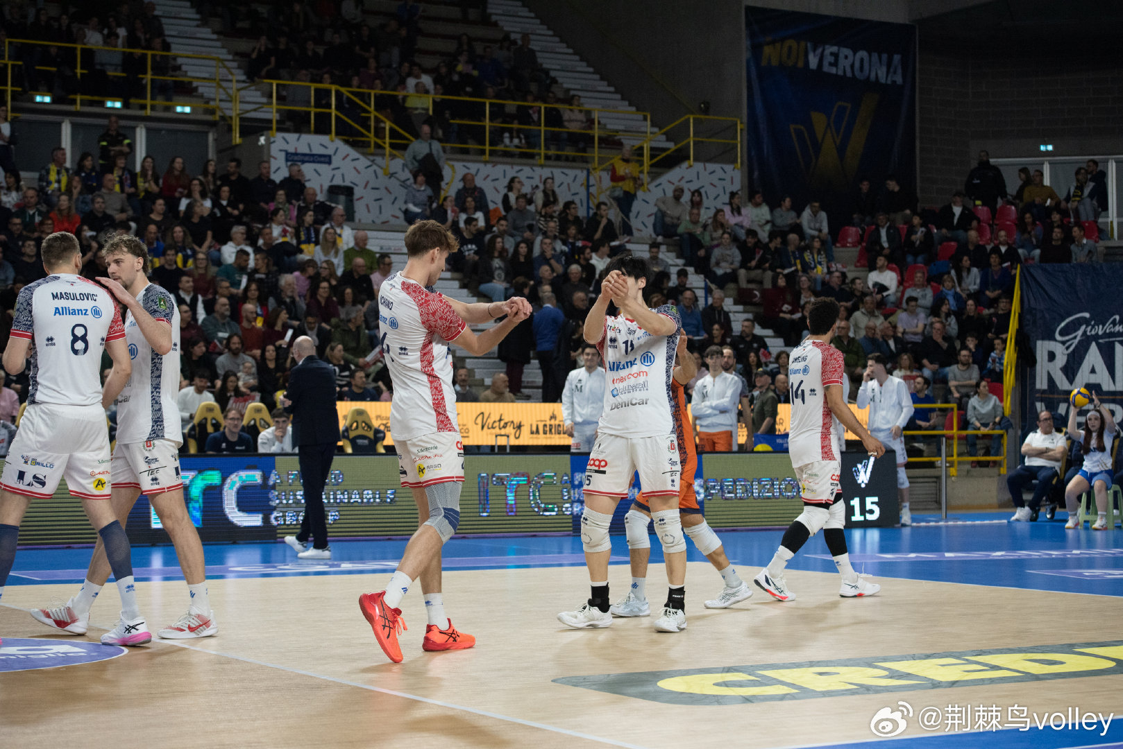 【意超男排】¼决赛第三回合,维罗纳主场2-3(24-26 24-26 25-22 25-23 10-15)不敌米兰,目前总比分维罗纳2-1暂时领先。日本主攻大塚达宣17分荣膺MVP。扣球70-55,拦网7-16,发球9-8,失误33-22