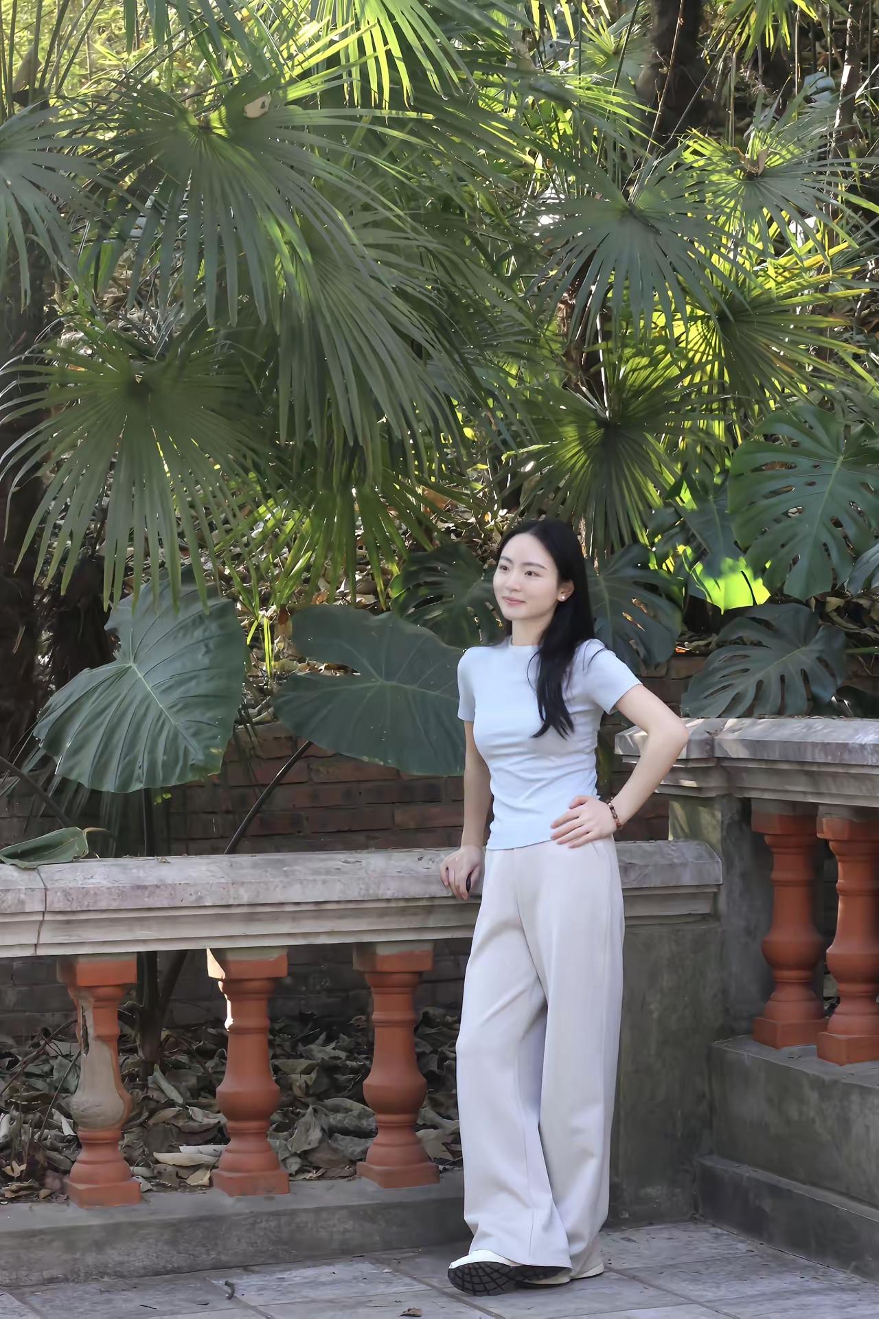 绿树阴中倚栏杆,笑看春风满面红。