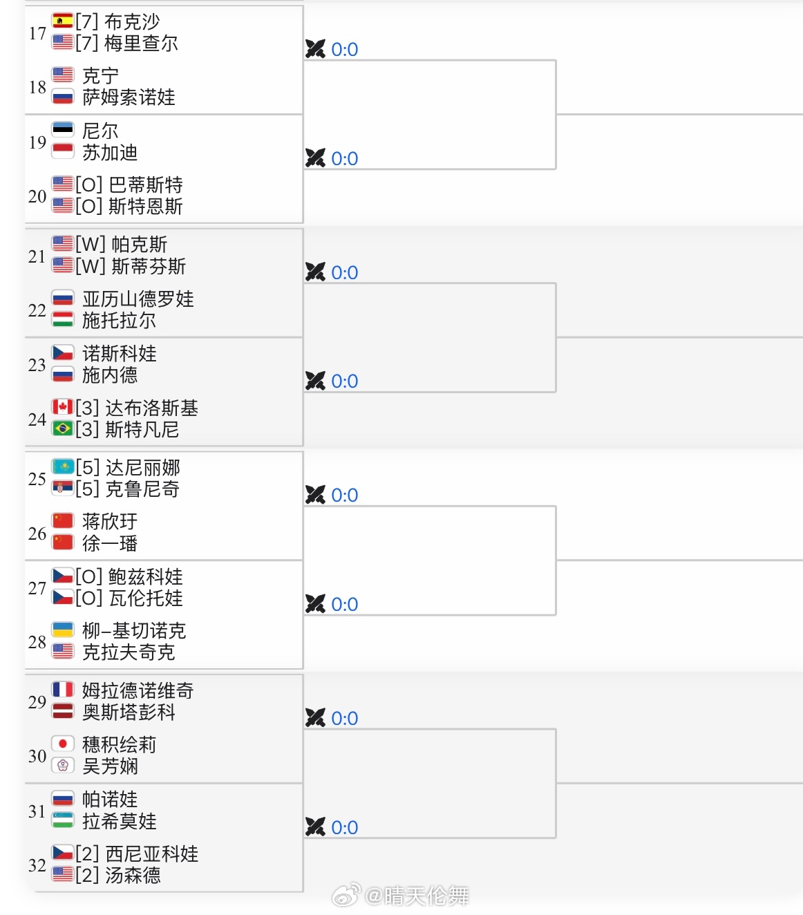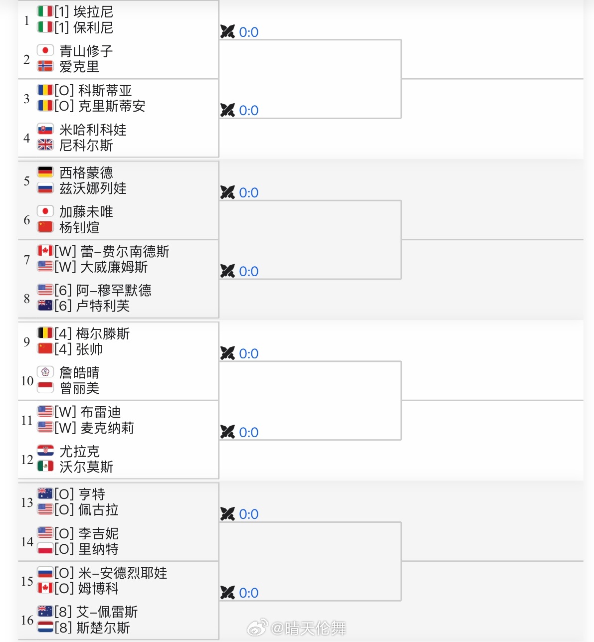 迈阿密WTA1000双打签表张帅🇨🇳/梅尔滕斯🇧🇪 vs 曾丽美🇮🇩/詹皓晴蒋欣玗🇨🇳/徐一璠🇨🇳 vs 达尼丽娜🇰🇿/克鲁尼奇🇷🇸杨钊煊🇨🇳/加藤未唯🇯🇵 vs 西格蒙德🇩🇪/兹沃娜列娃🇷🇺wta
