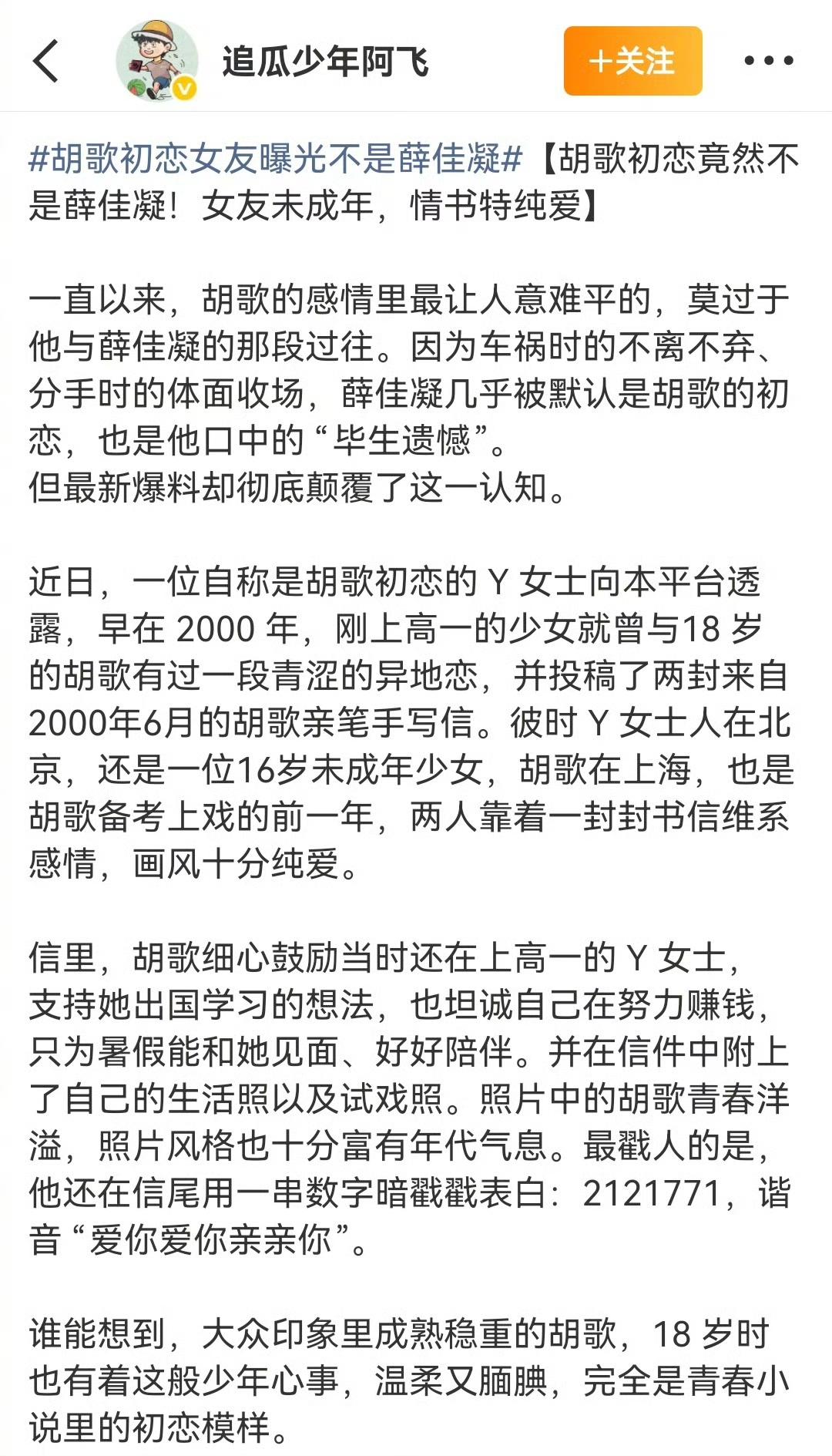 胡歌18岁手写信曝光!给初恋的纯爱文字太戳人,字迹清秀藏不住少年心事 谁的青春DNA动了!胡歌高中时期写给初恋的手写信被曝光,字里行间全是青涩又温柔的少年感。 这封写于2000年的信里,18岁的胡歌细心鼓励当时16岁的初恋出国学习,还坦诚自己在拼命赚钱,只为暑假能和她见面。信尾用一串数字“2121771”谐音表白“爱你爱你亲亲你”,连礼物都提前惦记,纯爱氛围直接拉满。 照片里的他穿着白西装,眉眼青涩,和现在成熟稳重的模样反差感十足。不过也有网友心疼:学生时代的私密物件被曝光,实在太缺德了! 胡歌 胡歌初恋 手写信