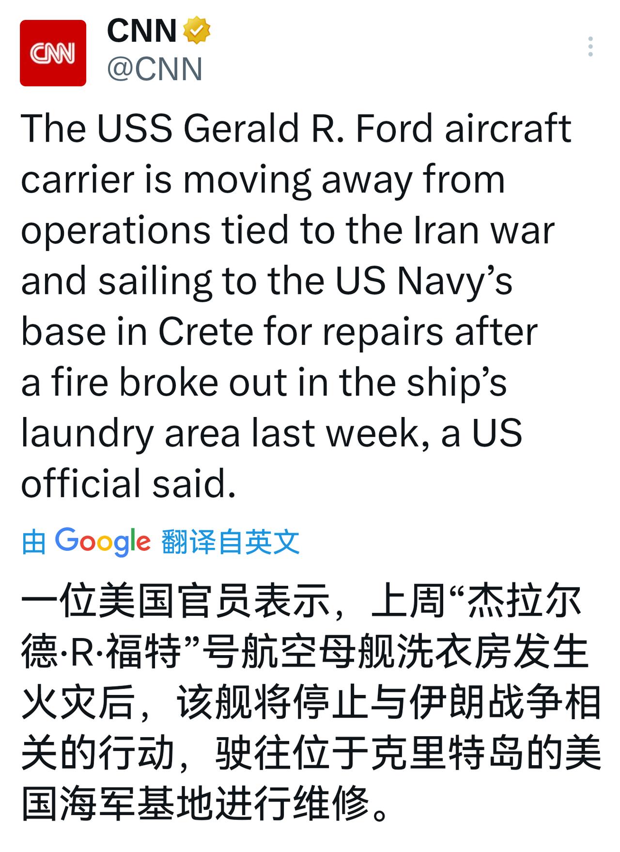 美国福特号航母失去战斗力,撤退2500公里。 美国军方说,福特号航母已经到达地中海的克里特岛,进行短期维修。航母战斗群的其他舰艇仍然在参与对伊朗的战斗。 福特号航母已经部署了超过10个月,从委内瑞拉又转战到伊朗。之前是堵厕所,后面又是洗衣房火灾。终于搞挂了,退出战斗。 这怎么看都像是部署久了,士兵情绪不稳定,天天搞事情啊。