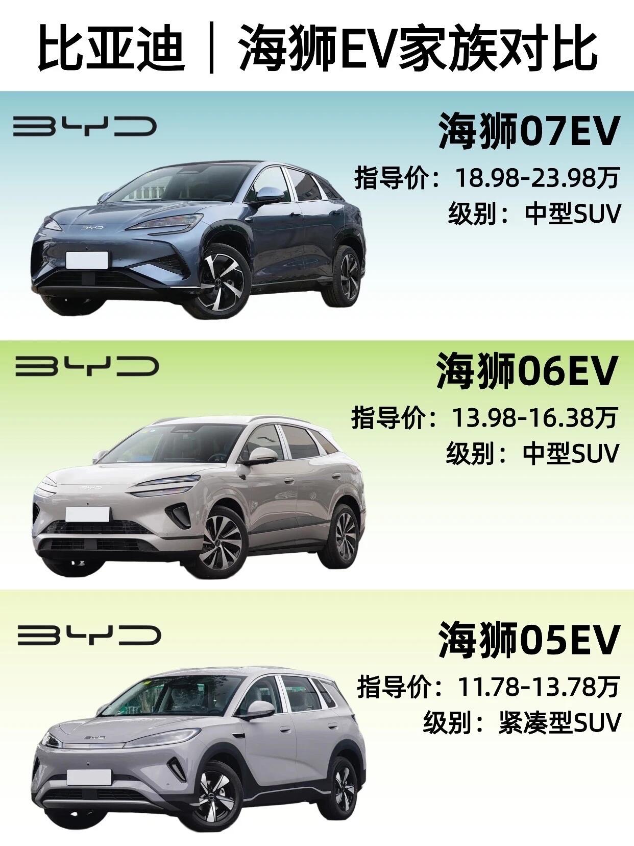 比亚迪海狮EV系列到底怎么选?05、06、07三款车看着长得差不多,价格拉开了好几万,到底差在哪儿?今天把三台车掰开了聊聊。 海狮05EV——入门之选,门槛最低 指导价11.78-13.78万,定位紧凑型SUV,是三兄弟里最"亲民"的一位。这个价位能买到比亚迪的纯电平台和刀片电池,性价比确实能打。车身尺寸相对小巧,城市通勤、找车位都不费劲,适合刚毕业或者家里第二台车的场景。不过紧凑型的定位也意味着后排和后备箱空间会有取舍,四口之家长途出行可能会觉得局促。 适合谁: 预算有限、主要城市代步、对空间没有极致要求的年轻用户。 海狮06EV——中间段位,均衡实用 指导价13.98-16.38万,同样是中型SUV的定位,但价格比07EV低了一个台阶。可以理解为海狮家族里的"水桶车"——没有特别突出的短板,空间、配置、续航都给到了够用的水平。外观设计偏圆润稳重,白色车身看起来挺清爽,家庭用户接受度高。如果你不想在05和07之间纠结太久,06其实是个省心的折中方案。 适合谁: 家庭用车为主、希望各方面都过得去、不想花太多钱上顶配的务实派。 海狮07EV——旗舰担当,拉满质感 指导价18.98-23.98万,是家族里的"大哥"。同为中型SUV,但从图上的外观就能看出来,07的设计语言更有高级感——前脸更锋利,轮毂样式更运动,整体气场和05、06拉开了明显差距。这个价位段比亚迪给到的智能化配置和底盘质感通常也会更上一层楼,适合对品质感有追求、预算也相对充裕的买家。当然,接近24万的顶配价格已经能看到不少竞品了,下单前值得多横向对比。 适合谁: 预算充足、看重设计和驾乘品质、把海狮EV当家庭主力车的用户。 怎么选?说点实在的 三台车的核心差异其实就两条线:一条是预算,一条是空间需求。 手头12万左右、主要自己开,05EV闭眼入,刀片电池的安全和能耗表现在这个价位很有说服力。家里有娃、需要后排经常坐人,06EV的空间和价格平衡得不错。如果预算能到20万附近,又希望开出去有面子、坐进去有质感,07EV是家族里最能撑场面的。 最后一句老话:参数只是参考,屁股才是标准。三台车都可以去店里实际坐一坐、跑一跑,方向盘的手感和后排的膝盖说了算。