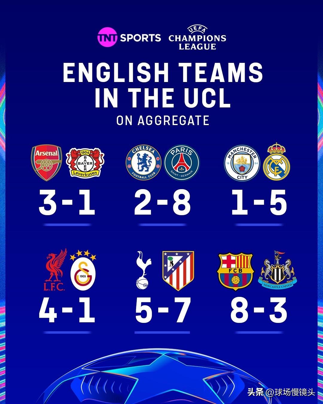 随着欧冠8强诞生——我有4大惊奇的发现 1,英超6队,最后留下的只有利物浦,阿森纳,其它4队,曼城,切尔西,热刺,纽卡斯尔遭遇不同程度大惨案! 2,16强赛,一共丟了68球,英超球队贡献30球,准确的说被淘汰的4之英超球队贡献28球! 3,最不被看好的葡萄牙体育,最后完成史诗级5:0博德闪耀翻盘晋级,可惜它遇到了最近5年的最强阿森纳!葡萄牙体育还会上演黑马奇迹吗? 4,皇马是最有能力,最有机会造曼城主场惨案的,但它没有那么做,反而一直收着踢,给曼城留有余地,而巴黎8:2,巴萨8:3,拜仁10:3绝对是一点脸面都不留,大家看出什么了吗? 欧冠8强对阵出炉 皇马 巴萨 阿森纳 拜仁 利物浦 大巴黎 马竞 葡萄牙体育