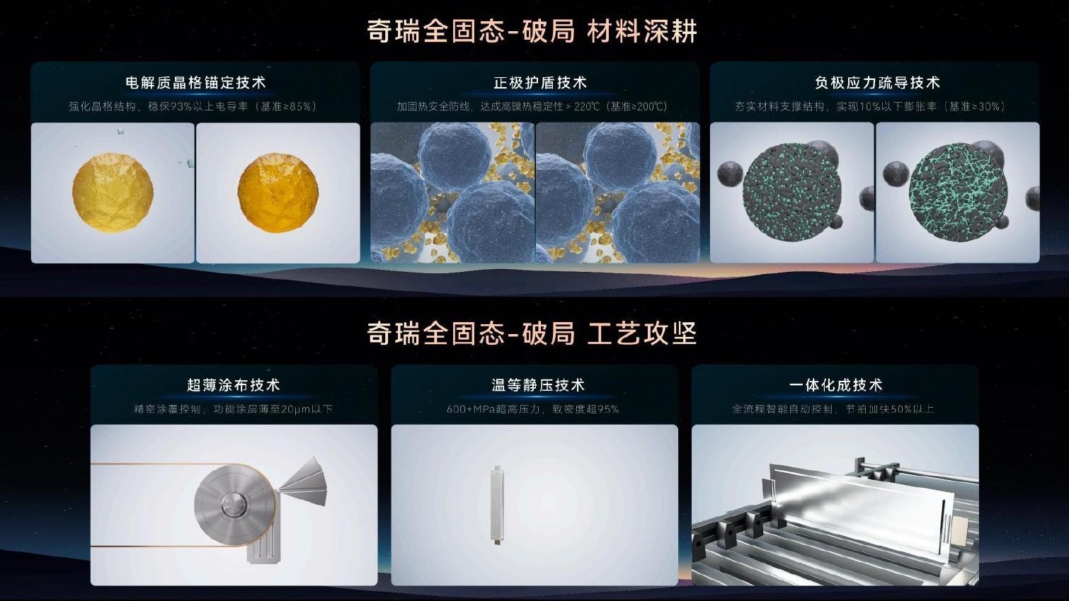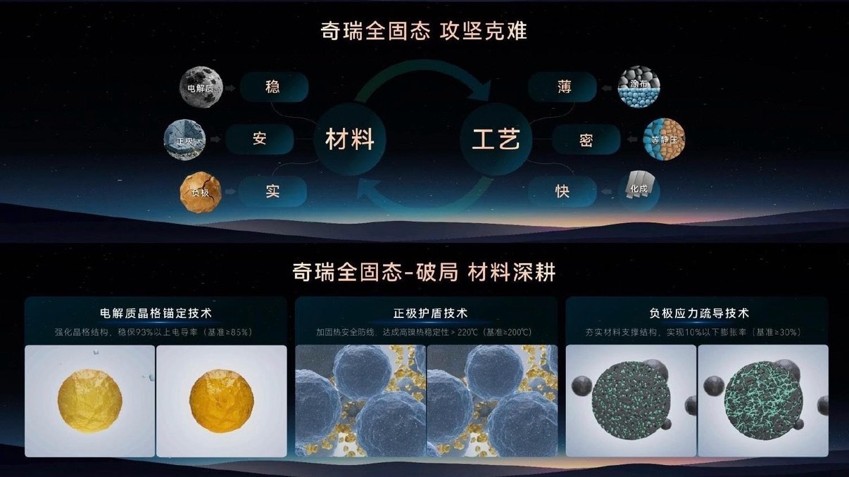 奇瑞这次展示的数据挺扎实。400Wh/kg已实现,向600Wh/kg突破,用的是硫化物+原位聚合复合路线。材料层面做了三件事:电解质晶格锚定保电导率、正极护盾提热稳定性、负极应力疏导控膨胀。工艺上温等静压600MPa、超薄涂布20μm以下,这些都是在解决"固-固界面"这个难题。