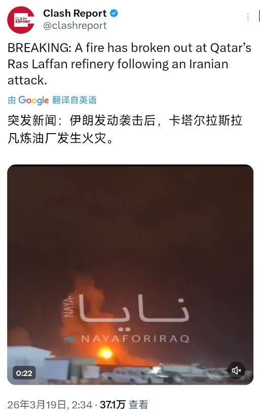突发新闻:卡塔尔外交部今天(北京时间3月19日)发布声明:“卡塔尔国强烈谴责伊朗公然袭击拉斯拉凡工业城,该袭击引发火灾,给该设施造成了重大损失。卡塔尔认为此次袭击是危险的局势升级,是对其主权的公然侵犯,是对其国家安全和地区稳定的直接威胁。该部重申,卡塔尔国保留作出回应的权利。” 当地时间3月18日早些时候,伊朗南部布什尔省的南帕尔斯和阿萨卢耶部分石油化工设施遭到美国和以色列的联合袭击。 伊朗伊斯兰革命卫队迅速作出反应,发出紧急警告,将沙特阿拉伯、阿联酋和卡塔尔三国的能源设施列为“合法打击目标”,还敦促相关区域民众尽快撤离。 拉斯拉凡工业城作为卡塔尔的核心能源枢纽,自然也在这份警告名单之中。 伊朗伊斯兰革命卫队随后采取了实际行动,向卡塔尔境内发射了五枚弹道导弹。 卡塔尔防空系统成功拦截其中四枚。剩余一枚直接命中拉斯拉凡工业城核心区域,当场引发大规模火灾。卡塔尔民防部门第一时间介入处置,目前已经将火势完全控制住。 值得庆幸的是,因为伊朗提前发出了警告,卡塔尔方面及时组织了人员疏散,这起袭击最终没有造成人员伤亡的报告。 拉斯拉凡工业城的重要性远超普通工业设施。这座位于卡塔尔多哈以北80公里的工业枢纽,是全球规模最大的液化天然气生产基地,其液化天然气产能占到全球总供应量的约五分之一,卡塔尔93%的液化天然气出口都依赖于此。 工业城内聚集了天然气制油厂、LNG储罐、炼油厂等一系列关键设施,还是全球最大的人工港之一,欧洲和亚洲多个国家的能源供应都高度依赖这里的输出。 此次导弹袭击给拉斯拉凡工业城带来了广泛且严重的破坏。卡塔尔能源公司已经证实设施遭遇“重大财产损失”,并且因为损毁严重,该公司被迫宣布“不可抗力”,暂时无法履行相关合同义务。 更值得关注的是,这座工业城在本月早些时候就曾遭遇伊朗无人机袭击,当时已经陷入生产停滞状态,此次导弹打击让恢复生产的前景变得更加渺茫。 卡塔尔方面对伊朗的行为反应强烈。除了外交部发布谴责声明外,卡塔尔还宣布将伊朗驻卡塔尔大使馆的武官及相关工作人员列为“不受欢迎的人”,要求他们在24小时内离境。 卡塔尔明确警告,如果伊朗继续采取类似的敌对行为,卡塔尔将采取进一步的措施来维护国家的主权、安全和自身利益。 伊朗方面则将此次行动定义为对等报复。伊朗官方表示,这次袭击隶属于“真实承诺-4”第63轮军事行动,核心目的是回应美以联合袭击伊朗本土能源设施的行为。 伊朗方面强调,其行动是根据《联合国宪章》第五十一条行使自卫权,并非针对卡塔尔这个邻国,伊朗仍致力于与卡塔尔保持良好的关系。 这起事件已经引发了国际能源市场的剧烈震荡。截至北京时间3月19日凌晨收盘,伦敦布伦特原油期货价格上涨3.83%,收于107.38美元/桶,盘中涨幅一度扩大至7%;美国WTI原油期货价格上涨近4%,盘中突破100美元/桶关口;美国天然气期货价格也同步上涨超过4%。 市场分析普遍认为,拉斯拉凡工业城的受损将直接加剧全球天然气供应的紧张预期,后续国际气价可能会持续走高。 目前,美国和以色列方面尚未就此次事件作出正式回应。 中东地区的局势因为这一系列的袭击和报复变得更加复杂敏感,而拉斯拉凡工业城的修复进度、卡塔尔后续是否会采取进一步反制措施,以及伊朗是否会继续扩大打击范围,都将成为影响局势走向的关键因素。 卡塔尔保留作出回应的权利,后续如何行动,也让这起事件的发展充满了不确定性。
