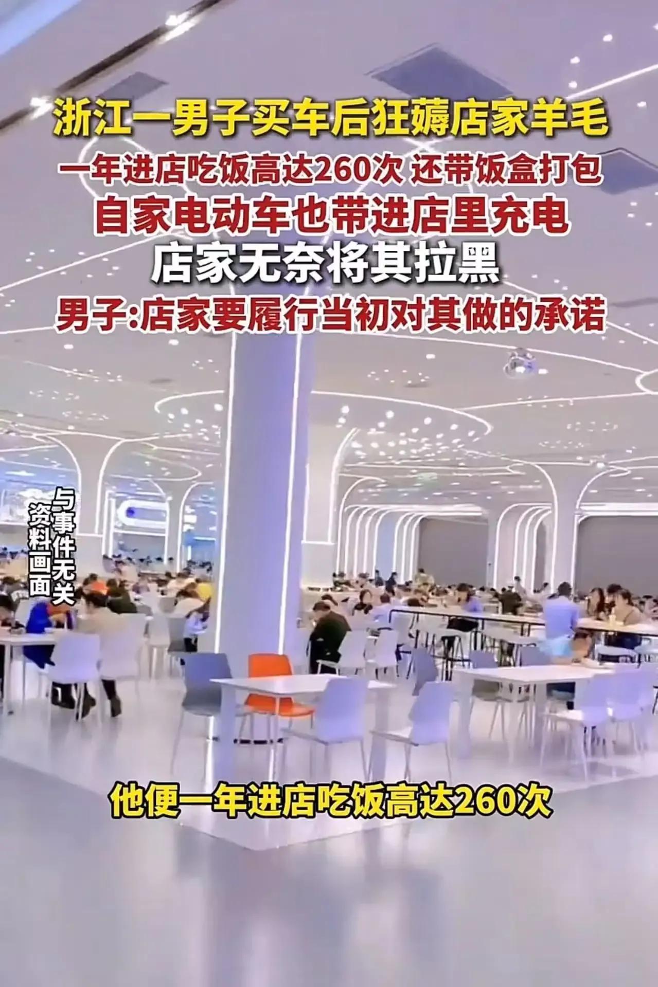 浙江一男子在4S店买车后,竟然一年进店蹭饭260次,还带饭盒打包,甚至把电瓶车也带去充电,这究竟是怎么回事? 据了解,这位男子在浙江某4S店购车后,发现了店内的“福利”——免费午餐。于是,他便开始了长达一年的蹭饭生涯,不仅自己吃,还带饭盒打包回家。更过分的是,他还利用店内的免费充电设施,不仅给自己的汽车充电,还把电瓶车也带到店里一起充。4S店一开始选择默许,但男子的行为越来越过分,店家终于忍无可忍,与男子发生了冲突。此事一出,网友们纷纷表示不淡定了,评论区炸开了锅。有网友表示:“哪家好人天天不上班去人家蹭饭啊?还打包,真是太过分了!”还有网友认为:“他把电瓶车装后备箱带过去充电,还有零食,这货应该全网曝光,就是因为像他这种人多了,才把各种普通人享受的福利取消了!” 这男子行为确实让人无语,不仅自己贪小便宜,还影响了其他人的正常福利。大家对于这件事怎么看呢?快来评论区留言,一起讨论一下吧!贪小便宜吃大亏,这句话对不对呢 人为什么会贪小便宜,会上当受骗呢