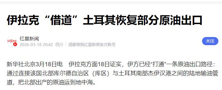 伊拉克石油部长哈扬·阿卜杜勒·加尼宣布: 伊拉克已决定从3月18日上午起,通过输油管道向土耳其杰伊汉港恢复石油运输。 为什么?因为南边的海路被封死了,油罐满了,财政空了,再不想办法,这个国家就要被钱憋死。 伊拉克和库尔德地方政府吵了那么多年,本该是同根同源的利益共同体,却在石油出口控制权、收益分成的问题上扯皮不休,甚至一度掐断了这条连接伊拉克北部基尔库克油田与土耳其地中海杰伊汉港的生命线,如今却不得不放下分歧、握手言和,说到底都是被现实的生存压力逼到了墙角,没有任何转圜的余地。 作为欧佩克第二大产油国,石油就是伊拉克的立国之本,全国超过九成的财政收入都依赖石油出口,一旦石油运不出去,整个国家的运转都会瞬间停摆,这也是此次伊拉克不惜放下多年恩怨,紧急重启输油管道的核心原因。 先说南边海路被封死的现实困境,这不是局部的航运受阻,而是整条核心石油运输通道陷入了事实性封锁。此前伊拉克的原油出口,九成以上都靠南部巴士拉港经霍尔木兹海峡海运出境,日均出口量稳定在330万桶左右,这条航道是伊拉克的石油命脉。 可随着近期地区冲突升级,霍尔木兹海峡航运安全急剧恶化,油轮根本不敢贸然通行,南部巴士拉石油终端的出口业务近乎停滞,日均出口量暴跌至不足80万桶,原本满载原油的油轮只能在海域外围徘徊,最后无奈原路折返,伊拉克的石油出口就此被掐住了咽喉。 海路彻底走不通,开采出的原油没了去处,国内的石油储罐很快就撑到了极限,权威数据显示,伊拉克境内的原油库存已经逼近98%的饱和线,储油罐满得再也装不下一滴原油,不少油田被迫大幅减产,产能直接砍到了原先的三成,甚至有部分油田因为无处存油,只能临时关停井口,这对于靠石油吃饭的伊拉克来说,无疑是釜底抽薪。 而油罐爆满还只是表象,财政空了才是真正的致命危机,伊拉克的国家财政结构极度单一,从公务员薪资、军队开支,到民生福利、战后重建工程,每一笔支出都仰仗石油美元。 海路封死、出口停摆的这段时间里,伊拉克国库几乎没有进账,外汇储备快速消耗,原本就不算充裕的财政资金彻底见底,基层公务员工资迟迟发不下来,医院的药品、柴油开始配给供应,就连基础的公共服务都难以为继。 民间物价随之小幅上涨,民众的焦虑情绪不断蔓延,整个国家都被缺钱的阴影笼罩,再不想办法打通石油出口通道,伊拉克真的会被资金链断裂拖垮,这也是石油部长直言“再不想办法就要被钱憋死”的底气所在。 而摆在伊拉克面前的唯一出路,就是重启这条通往土耳其杰伊汉港的输油管道,可这条管道却因为中央政府和库尔德地方政府的多年争端,长期处于停摆状态。 双方的矛盾由来已久,库尔德自治区坐拥伊拉克北部优质油田,一直想自主掌控石油出口权,未经中央同意就擅自通过这条管道向土耳其出口原油,截留大部分收益;而巴格达中央政府坚持石油出口权归国家所有,收益必须按比例统一分配,双方为此争执不断,甚至闹上了国际仲裁法庭。 2023年国际仲裁机构裁定土耳其需向伊拉克赔偿相关损失,土耳其随即暂停接收伊拉克原油,这条管道彻底停运,伊拉克也因此失去了唯一的陆上石油出口通道,原本能化解海运风险的备选方案,变成了内耗的牺牲品。 可现在面对国家生死存亡的危机,再纠结过往的利益分歧已经毫无意义,中央政府和库尔德地方政府都清楚,继续内斗只会两败俱伤,此次重启输油运输,没有漫长的谈判拉锯,没有复杂的长期协议,只是双方在紧急状态下的临时妥协:双方成立联合委员会管控管道运营,原油出口收益全部进入联邦国库统一分配,油田和管道沿线的安全由双方共同值守,一切都以快速打通出口通道、回笼救命资金为核心。 土耳其方面也乐见其成,杰伊汉港作为地中海重要石油转运枢纽,重启管道既能获得过境收益,也能稳固自身在中东能源格局中的话语权,三方一拍即合,这条停运已久的管道终于在3月18日上午重新输油,初始日输送量达到25万桶,虽然远不及海运规模,但对于眼下的伊拉克来说,已是雪中送炭。 而伊拉克的这场石油突围,也只是中东能源乱局的一个缩影,地缘冲突、内部矛盾、航运风险,任何一个变量都能轻易撼动石油国家的经济根基,这也让外界看清,靠资源吃饭的国家,终究要面对资源之外的生存考题。
