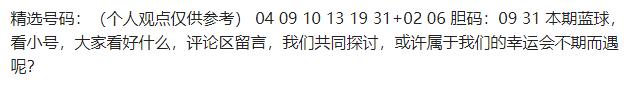 辛丹丹来啦!这篇是丹丹小美女亲自下场分析:蓝球02 06 07 11整体偏中小,其中06 07接近上期05应该是追热号,但剩余的以09为代表的大冷号丹丹几乎从不染指,追热思路很坚定;红球双胆09 31,前者是隔期重号,本期再开又是隔期重号,后者直接复制上期凤尾,近期标准大号凤尾终于开始回补。大家对今晚丹丹意见有何看法,欢迎评论区来聊聊!